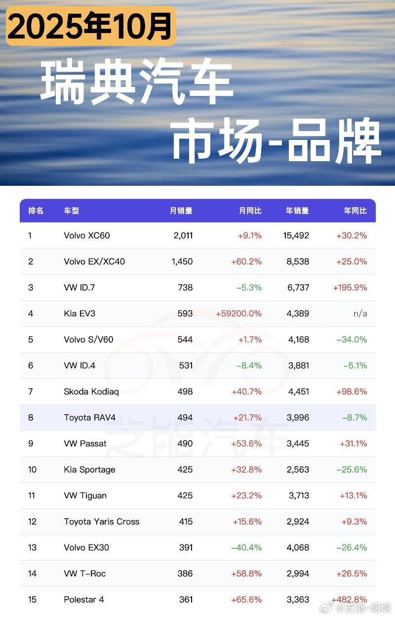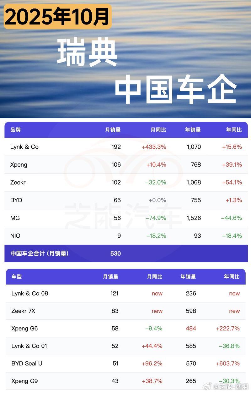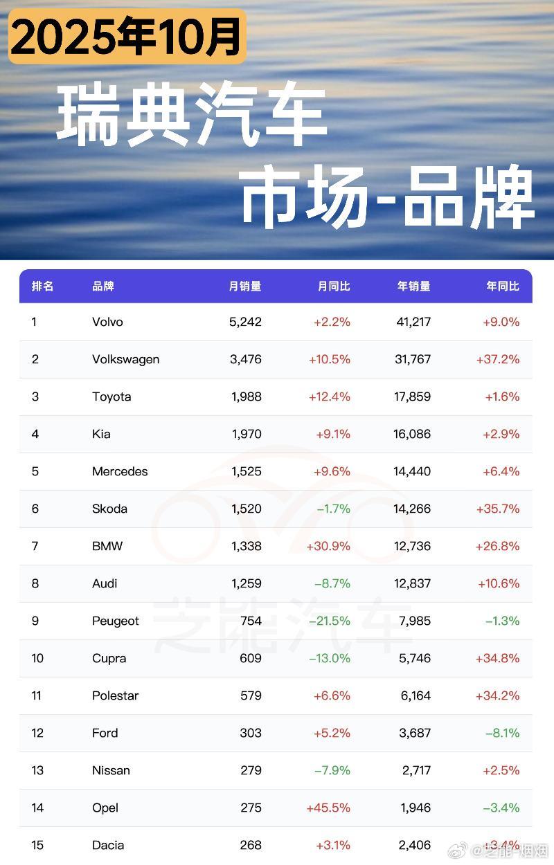 2025 年 10 月瑞典新车市场同比微跌,累计销量仍保持增长。市场电动化程度领先欧洲,可充电车型占比超六成,插混比例居欧洲首位。