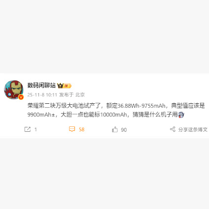 手机电池将进入1万毫安时代11月8日,据博主数码闲聊站爆料,荣耀第二块万级大电池试产了,额定36.88Wh-9755mAh。典型值应该是9900mAh±,大胆一点也能标10000mAh。这将是全球第一款10000mAh电池量产智能机,引领行业进入10000mAh时代。结合此前爆料,这块电池大概率由荣耀Power 2机型首发,将在春节前登场。