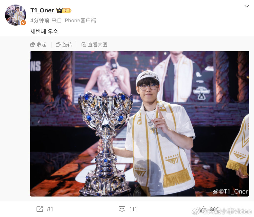 【Oner赛后发博】Oner晒和奖杯合照 11月10日,赛后发博,晒和奖杯合照,并配文:“第三冠!”