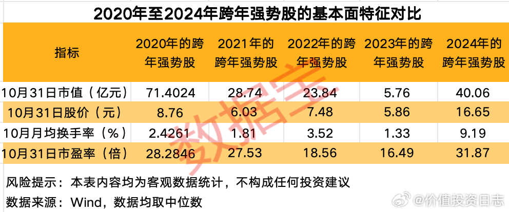 一是市值小。以历年10月31日的市值来看,2020年以来跨年强势股的市值中位数均低于A股整体的市值中位数。2023年跨年强势股市值中位数不足18亿元,A股整体市值中位数超过52亿元;2024年跨年强势股市值中位数低于34亿元,A股整体市值中位数超过50亿元。