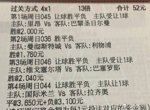 亮哥今日四串推荐:045让胜 036胜 046让胜 044让平 让负