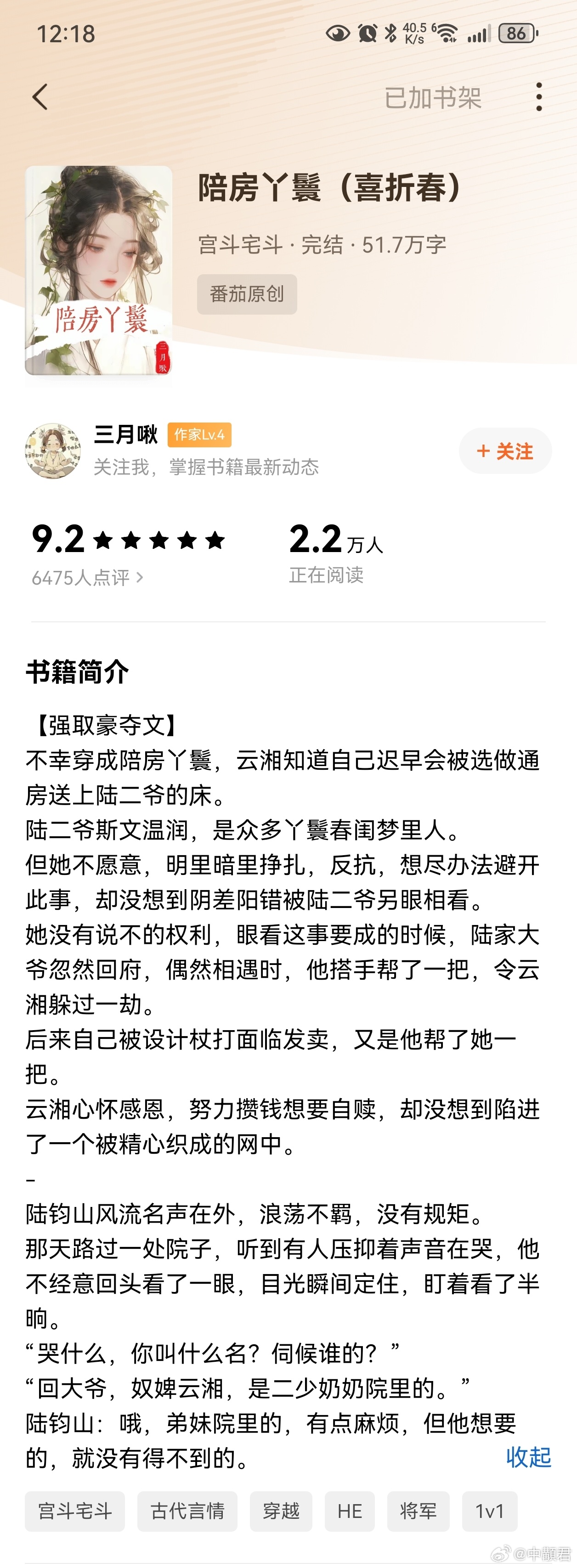 昨天看完的一本,好看的,很久没看强取豪夺类型的文了,还不错,注意排雷,男主前期是烂黄瓜,接受不了的别看,而且设定是封建时代,男主的时代局限性是有的,虽然后期只有女主一个,但是要做到完全尊重女主之类的还是不行言情小说推荐推文番茄好文
