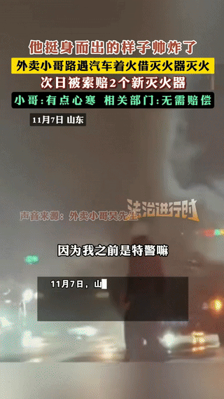 他挺身而出的样子帅炸了 !外卖小哥路遇汽车着火,借灭火器灭火 ,次日被索赔2个新灭火器 。小哥:有点心寒 。相关部门:无需赔偿 11月7日山东的夜晚,泰安某商场附近一辆车突然自燃,火越烧越大。这时,一位外卖小哥吴先生路过,他以前是特警,看到这情况,想都没想就冲去附近警务室借了两个灭火器。 他拿着 灭火器就往着火的车那冲,根本没顾上汽车可能爆炸的危险,一门心思就想赶紧把火灭了。灭火的时候,他心里想的就是救人救火,其他啥也没考虑。 灭完火,他把灭火器放回警务室附近就走了,因为还有好几个外卖单超时了,得赶紧去送。 可第二天,他却被要求赔两个新的灭火器,这让他有点心寒。他今天都没跑单,就为了这事儿找相关部门协调。 好在经过协调,相关部门说不用他赔了。 说真的,小哥见义勇为,最后还被要求赔偿,任谁心里都得膈应。虽然最后不用赔了,但这事儿也提醒咱们,不能让好人在做好事的时候还得担心自己吃亏,得给好人足够的底气,这样才会有更多人敢挺身而出。