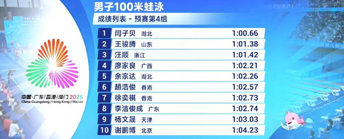 全运会男子100米蛙泳预赛,老将汪顺1:01.42位列小组第三。