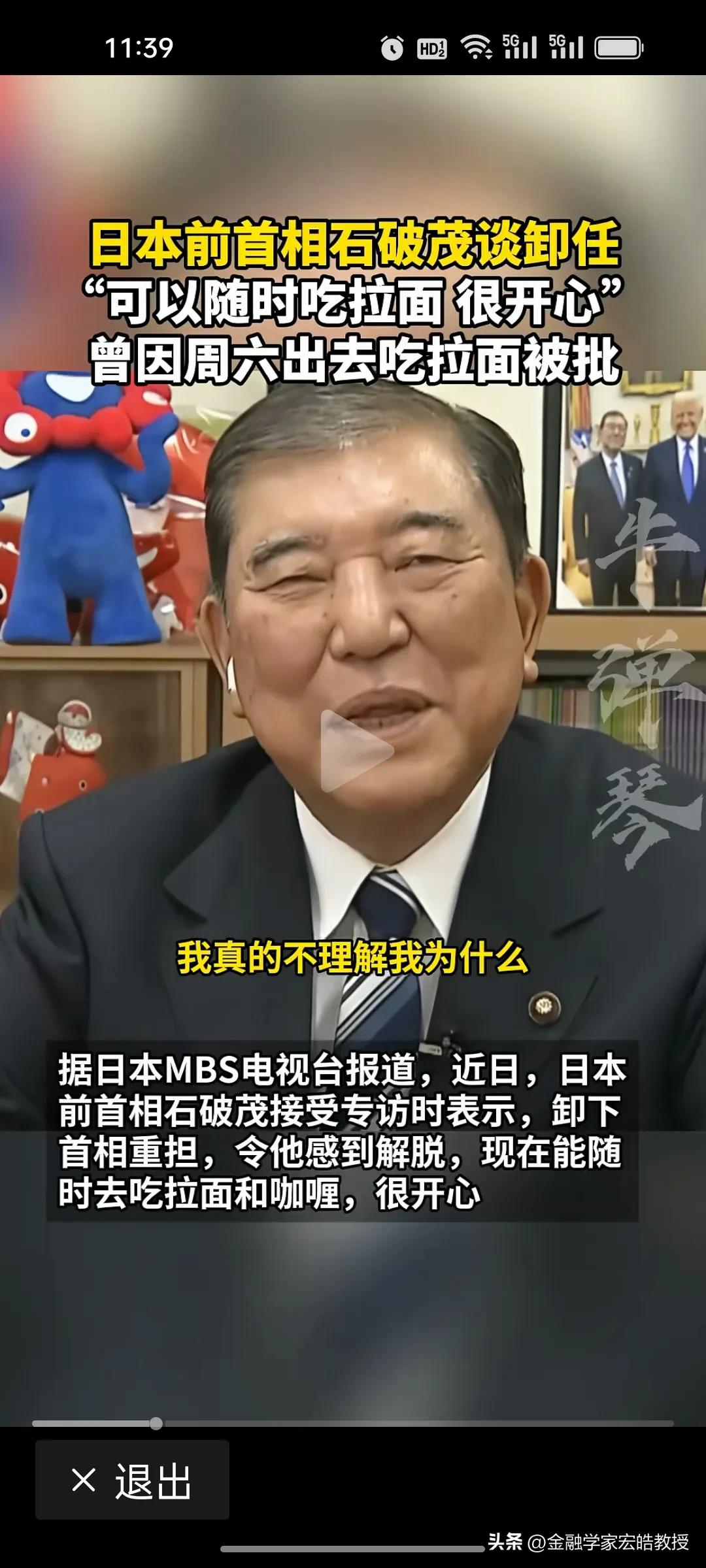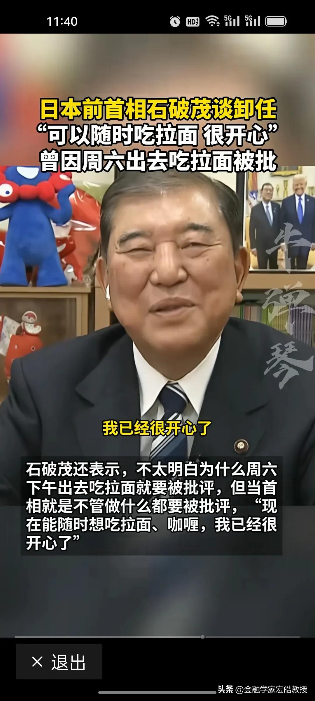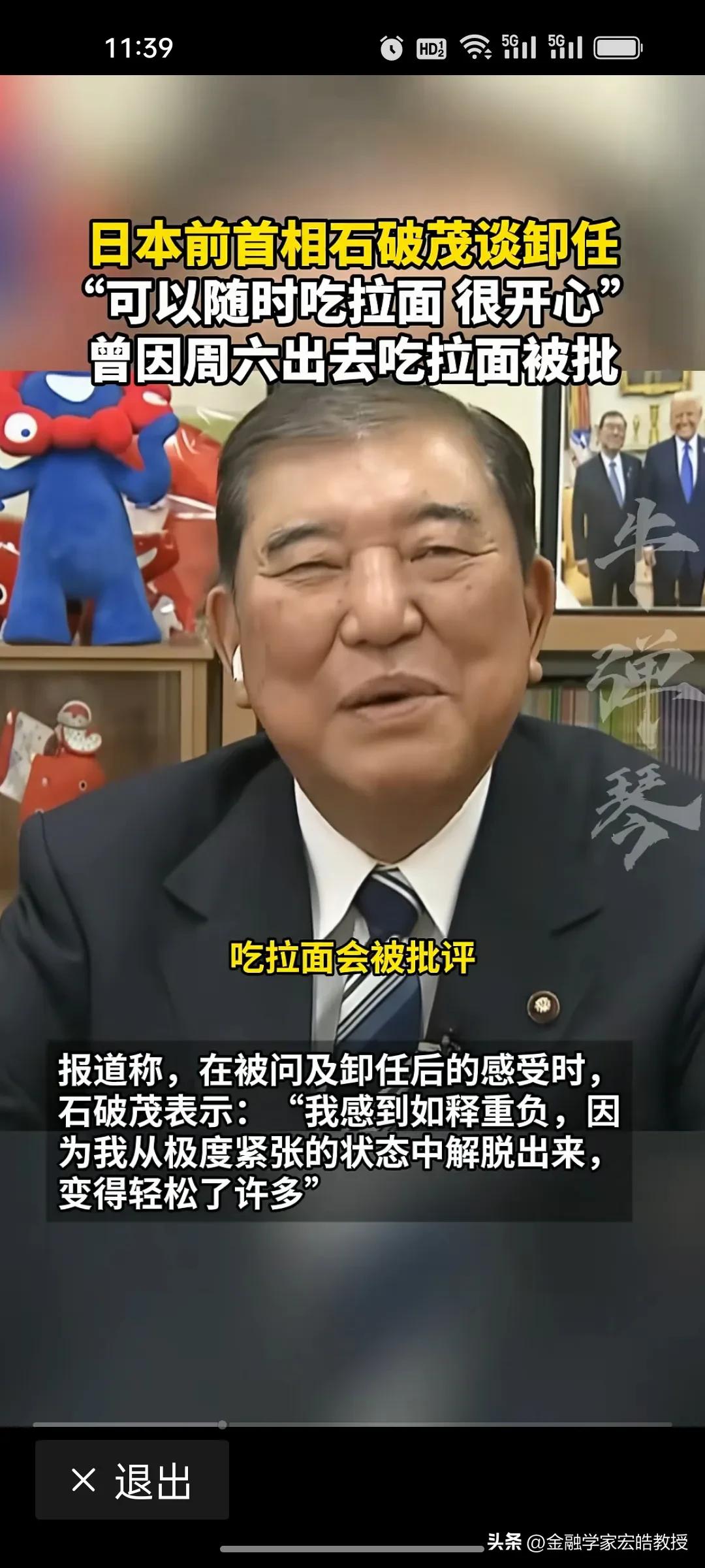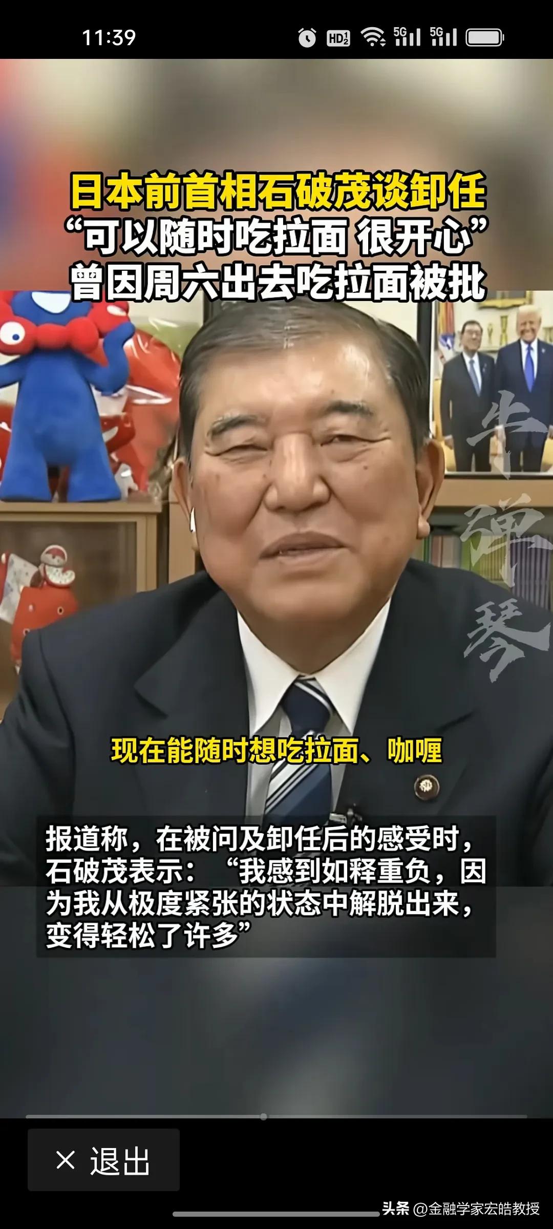 只当了一年首相的石破茂终于实现了拉面自由啊!石破茂卸任首相后,感慨万千,像是吃了一肚子委屈,接受日媒采访时候大倒苦水,说自己就任首相时,实在想不通,为什么周六下午吃拉面都要被批评,现在解脱了,随时可以出去吃拉面和咖喱,很开心。 相反,现在高市早苗压力山大,平均每天只睡三个小时,凌晨三点还在开会,下属也只能通宵待命,高市早苗这种放弃工作与生活平衡的作息能够挺多久,引发强烈的舆论争议。