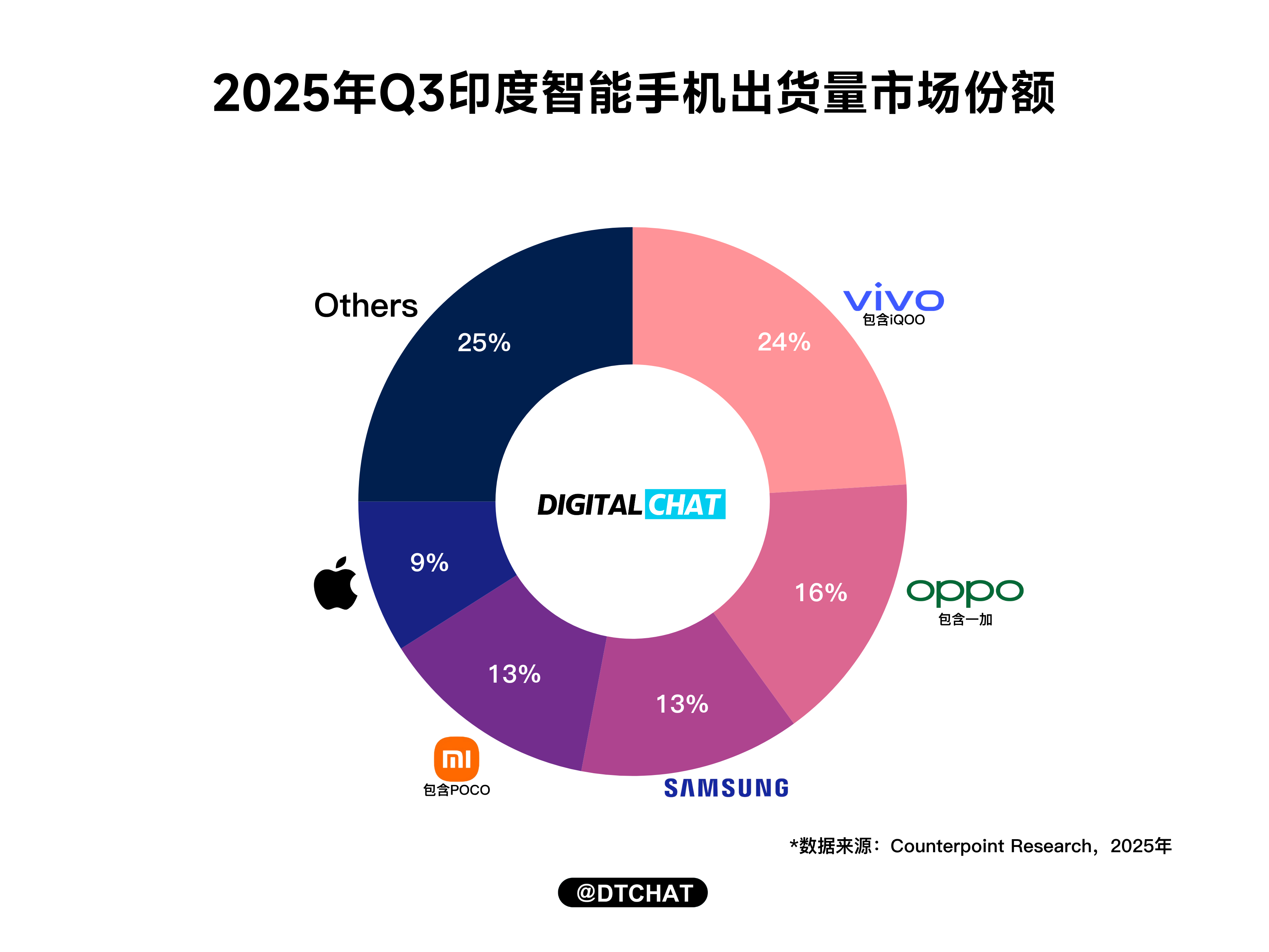 Counterpoint公布了2025年Q3印度智能手机出货量数据,整个手机市场出货量是同比增长5%,出货金额同比增长18%,达到季度历史最高。但是在市场份额方面我发现前五大厂商中国产手机厂商的市场份额加起来超过43%了,加上真我、摩托罗拉这些,差不多有一半了。