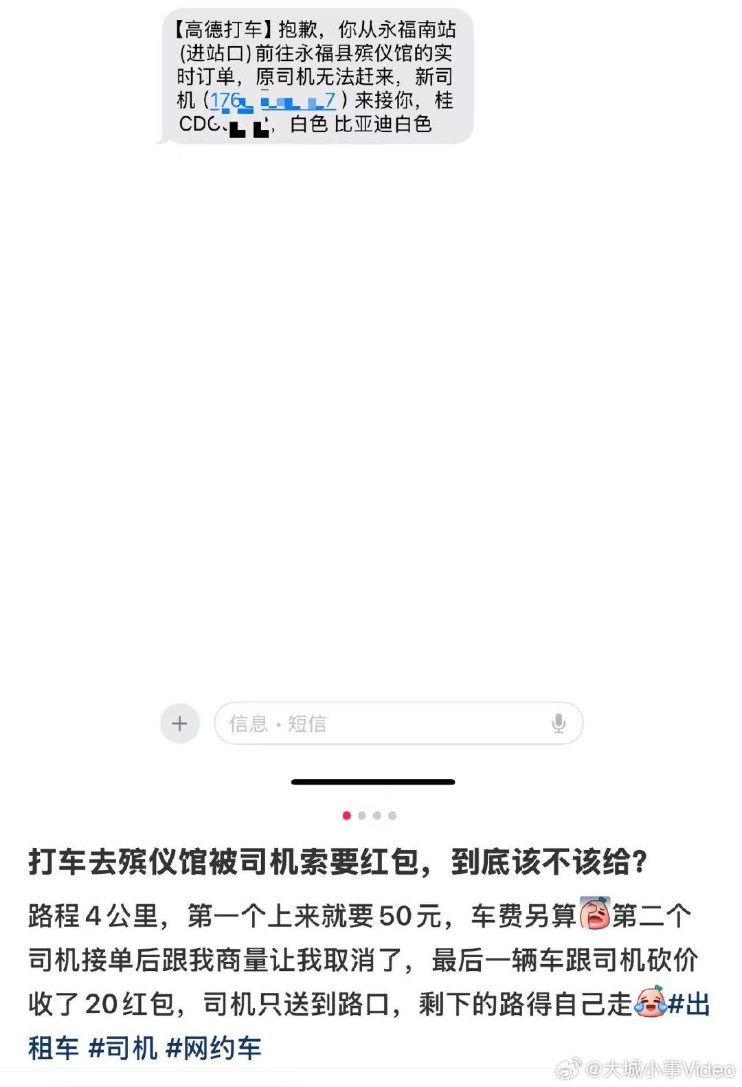 【打车去殡仪馆被多个司机要红包】打车平台回应去殡仪馆要红包 近日,广西桂林一名网友发帖称,自己在打车前往殡仪馆途中,被多个司机索要红包。