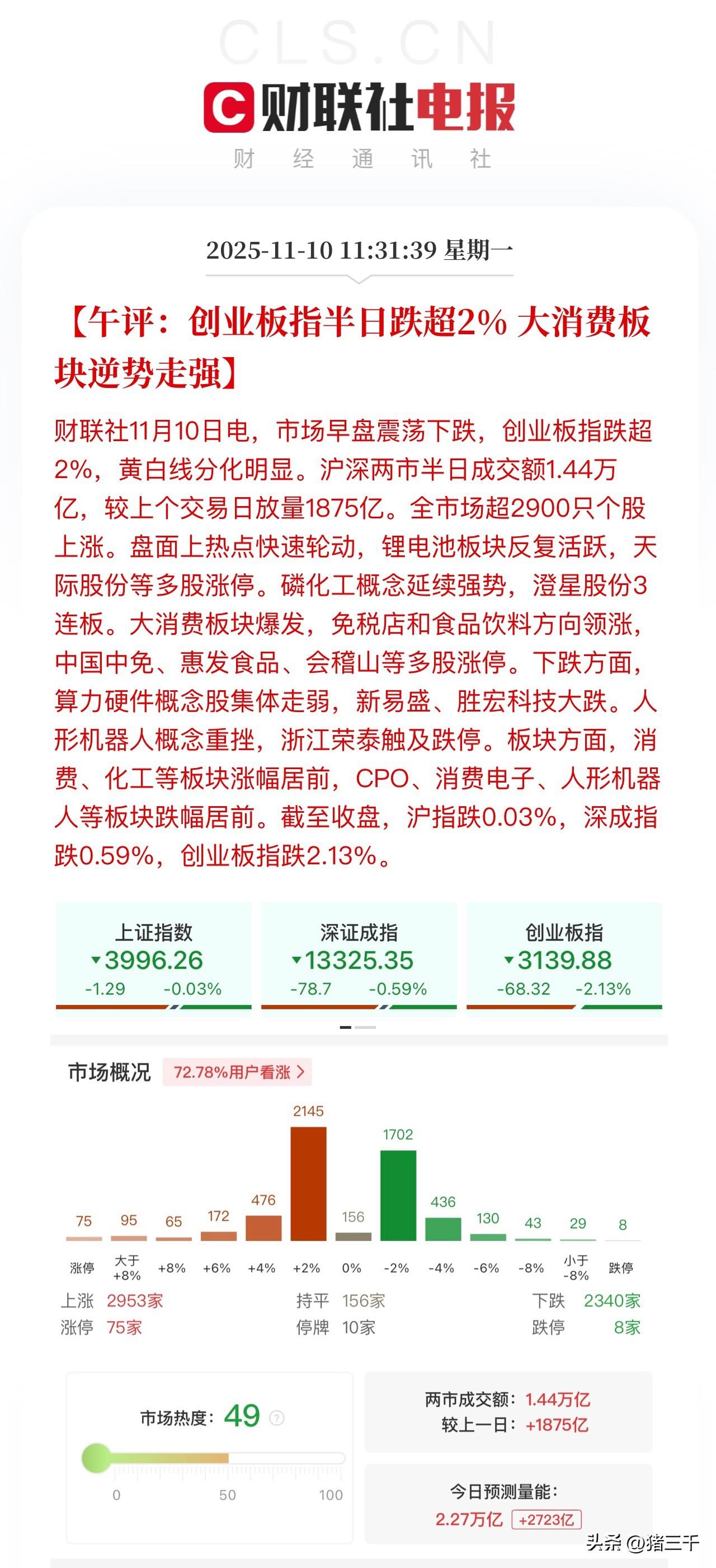午评,消费欢天喜地科技避之不及! 上午主流消费股能动的全动起来了, 消费也在演绎强者恒强: 奶酪龙头妙可蓝多, 宠物经济中宠股份, 零食龙头盐津铺子、万辰集团, 成瘾性消费有友食品, 鲜奶龙头新乳业等; 火锅料龙头安井食品则属于严重低估! 白酒方向, 会稽山强者恒强, 舍得酒业继续股性活跃, 舍得酒业和酒鬼酒显然舍得酒业基本面更好了, 会成为优先选择项! 山西汾酒、泸州老窖基本面硬! … 下午看医药股能否跟进, 上午主要是疫苗股百克生物等有表现, 主要受到流感季需求刺激! 牙科通策医疗基本面改善但股价力度不够, 中药和创新药都有上攻动能! CRO方向康龙化成等基本面好, 药明康德阶段调整后估值足够便宜, 创新高问题不大! … 电池板块矿领涨, 其它方向早盘走了分化, 固态电池设备龙头先导智能杀人气, 毕竟股东户数从10.72万增至28.09万, 不洗盘是不可能的!