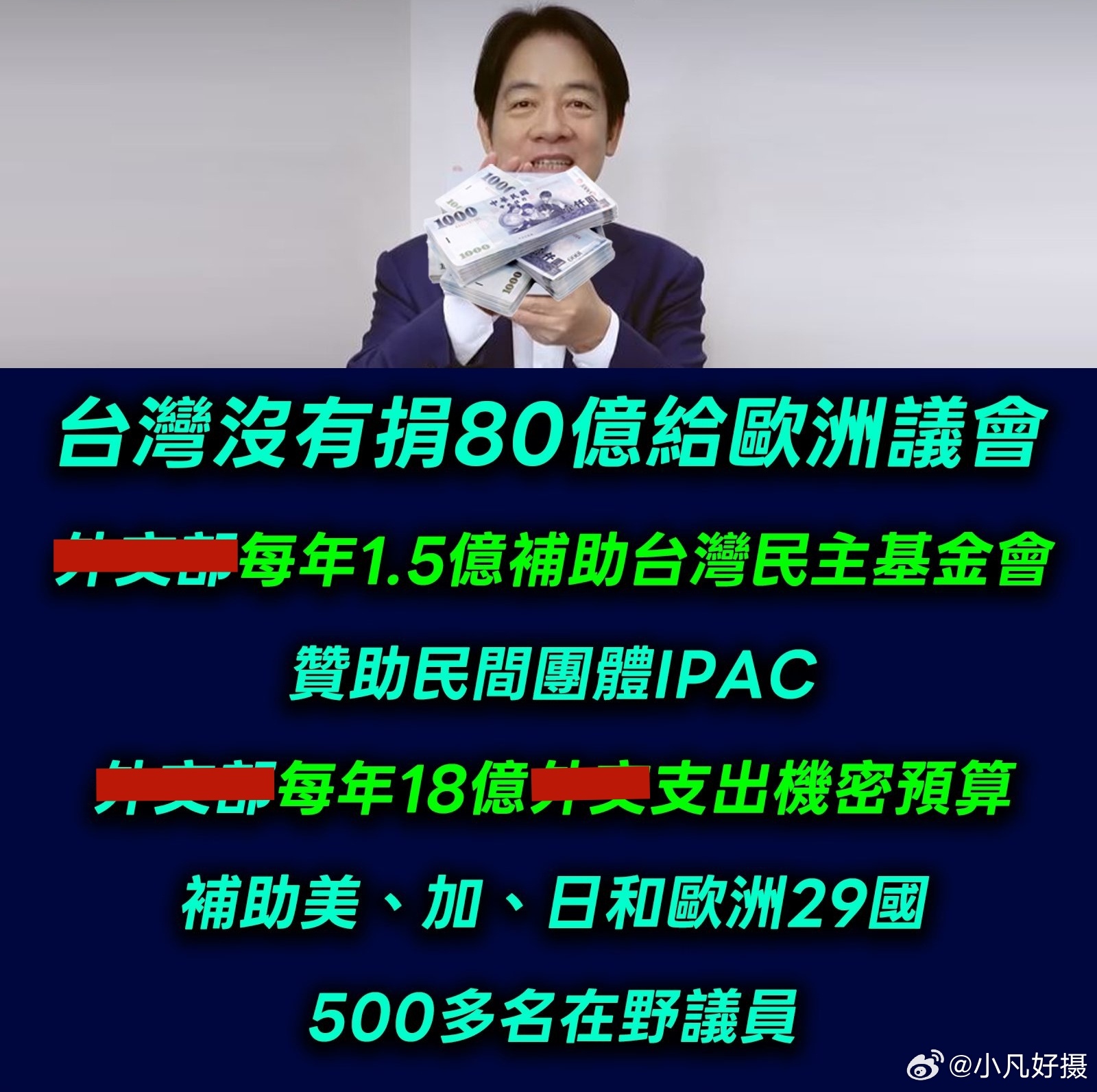 台独团伙自嗨的“重大突破”搞清楚了:没有捐80亿欧元给欧洲议会,是每年18亿机密预算补助外国在野议员。[笑cry]