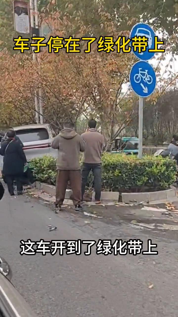 万万没想到这车开到了绿化带,来看看,撞到了路灯。这什么车?气囊。