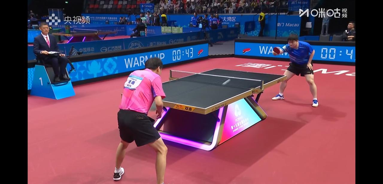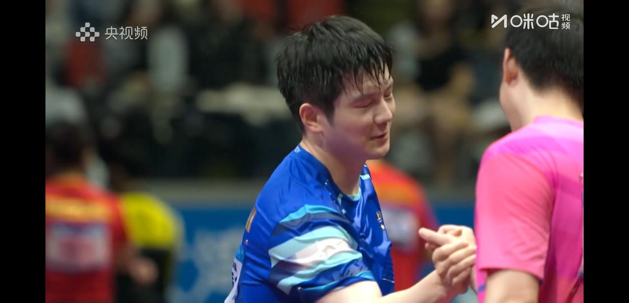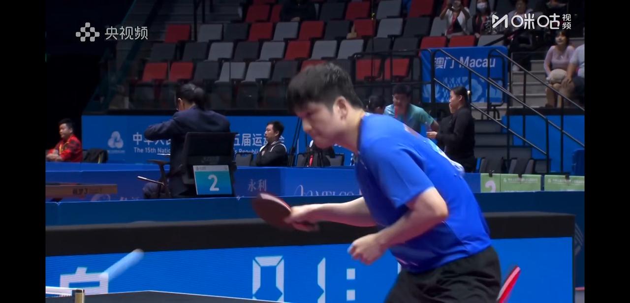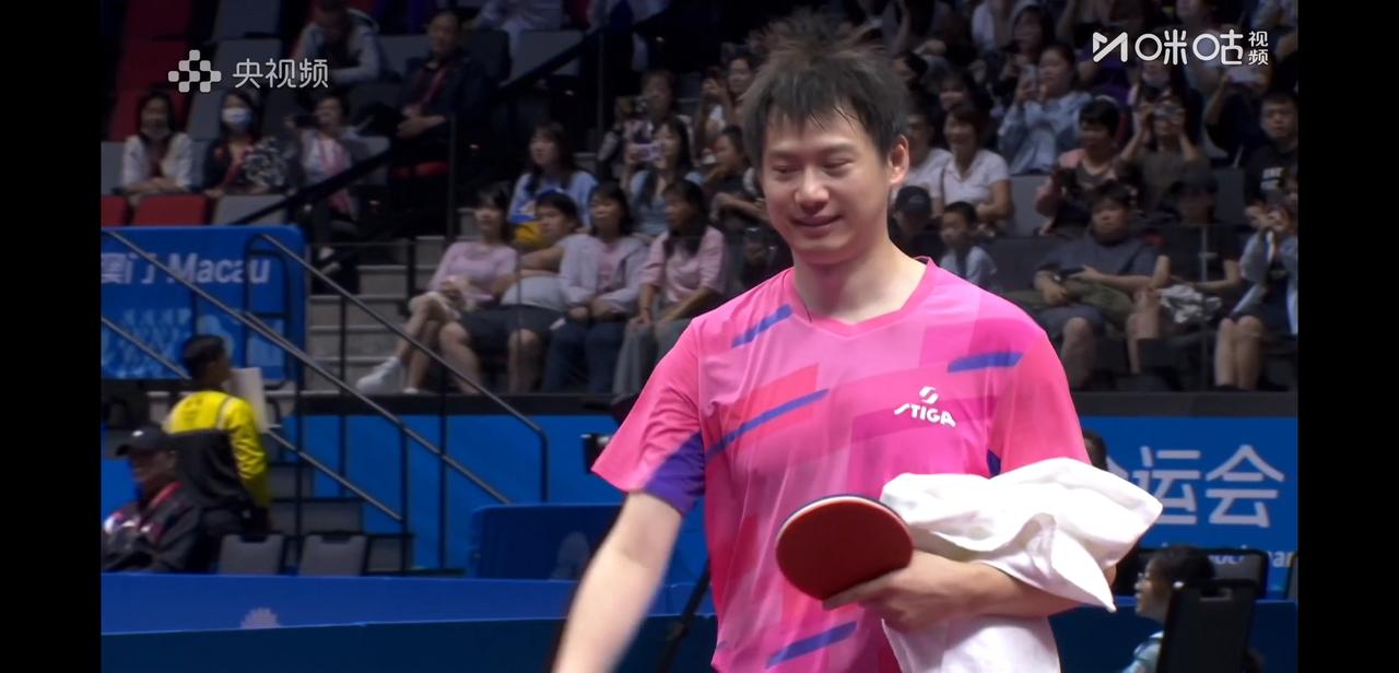 全运会男单1/16决赛, 上海队樊振东vs河北队周雨, 第一局两个人打的还是比较胶灼的, 12:10樊振东先拿下一局。 接着樊振东连续拿下三局, 周雨虽然一直在努力想办法, 但无奈樊振东更胜一筹。 大比分4:0樊振东男单晋级。 最后打完握手环节, 两个人都笑了。