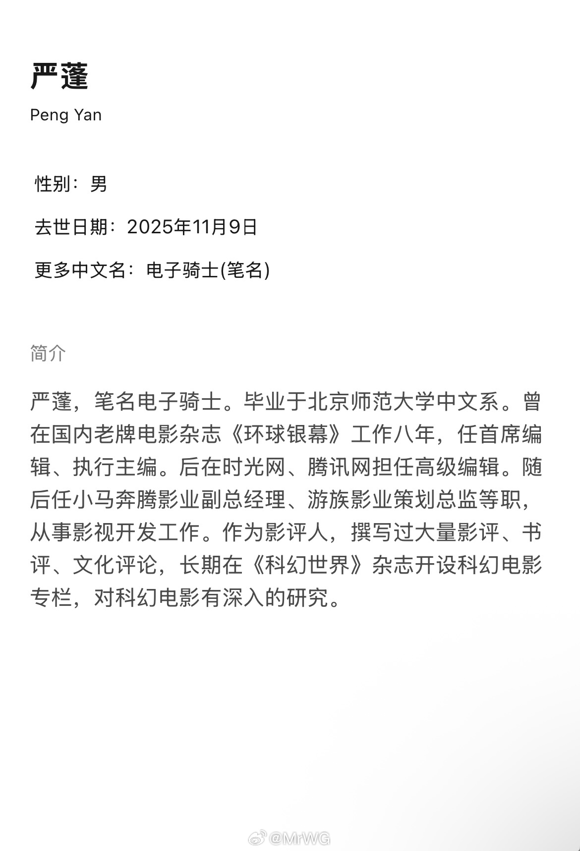 电影[超话]知名影评人电子骑士去世 最早开启写影评,是从当年认真做影评博客的时光网开启,受过电子骑士老师的推荐,感谢。🙏 《环球银幕》也留下他许多重要笔墨,是曾让影迷获益的杂志。向真正爱电影、为电影评论事业做出过贡献的人致敬,走好。🕯️