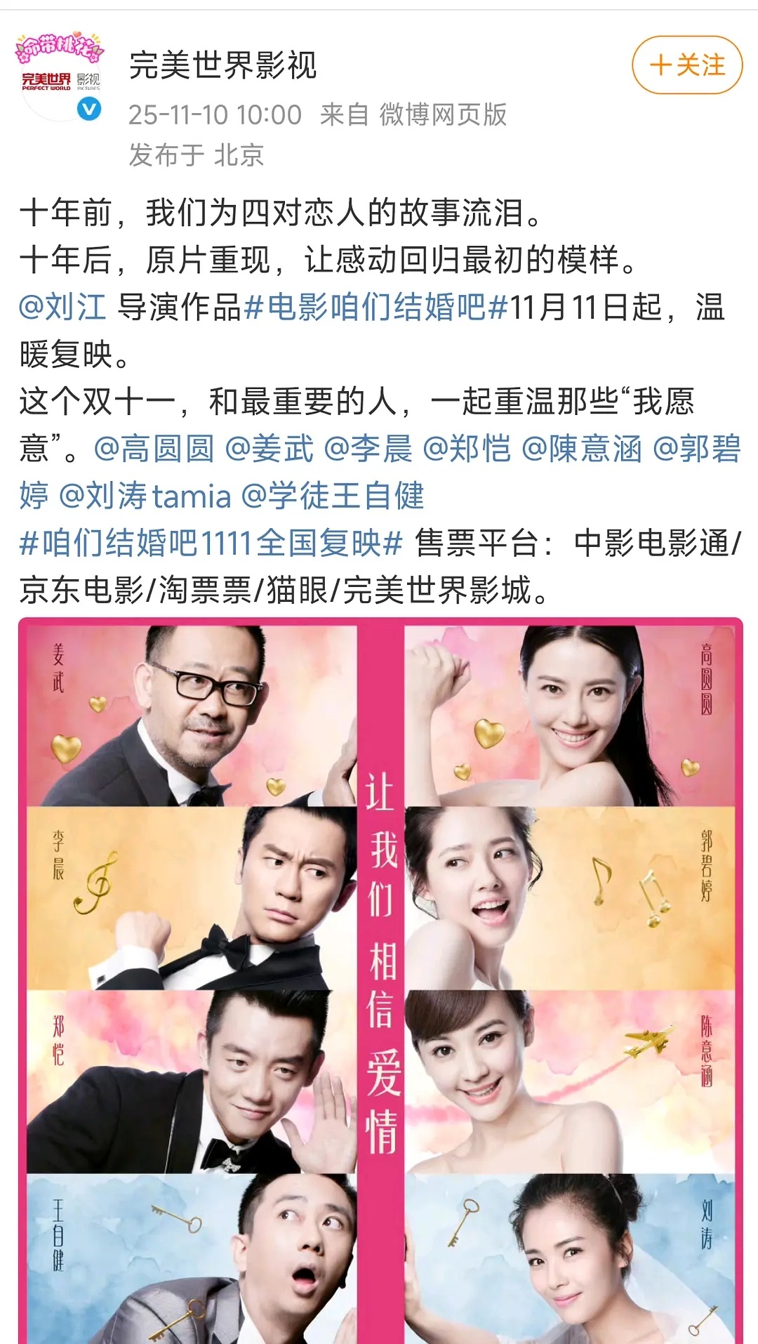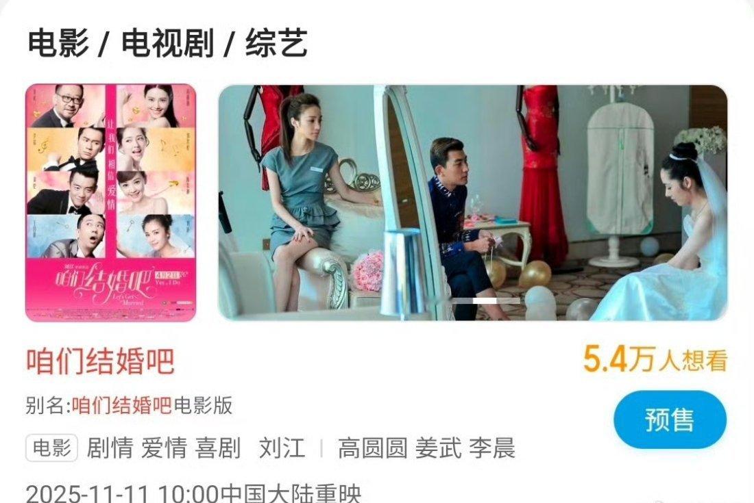 今年双十一电影《咱们结婚吧》要重映[吃惊][吃惊]主演是高圆圆、姜武、李晨、郑凯、郭碧婷、刘涛、王自健
