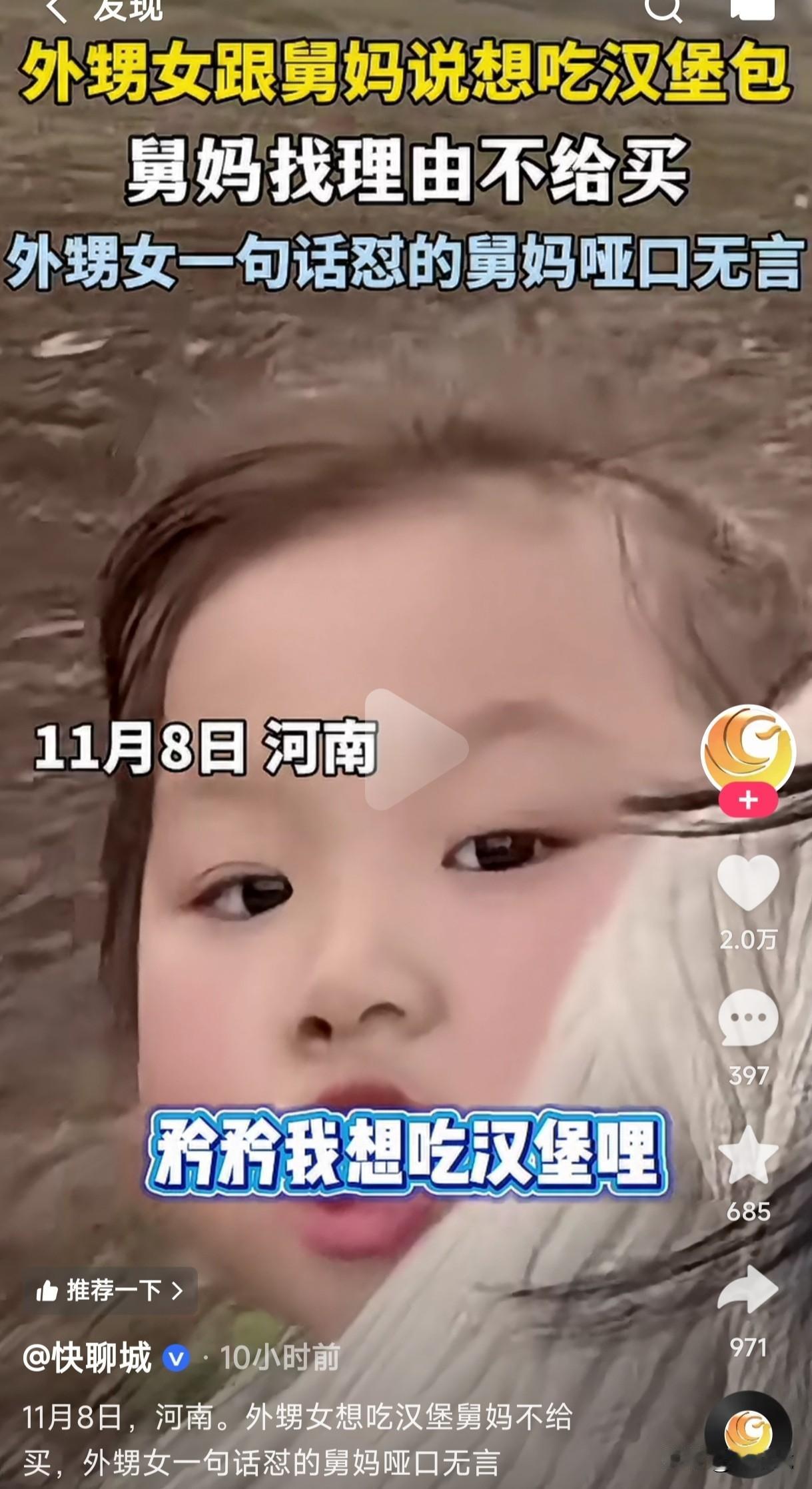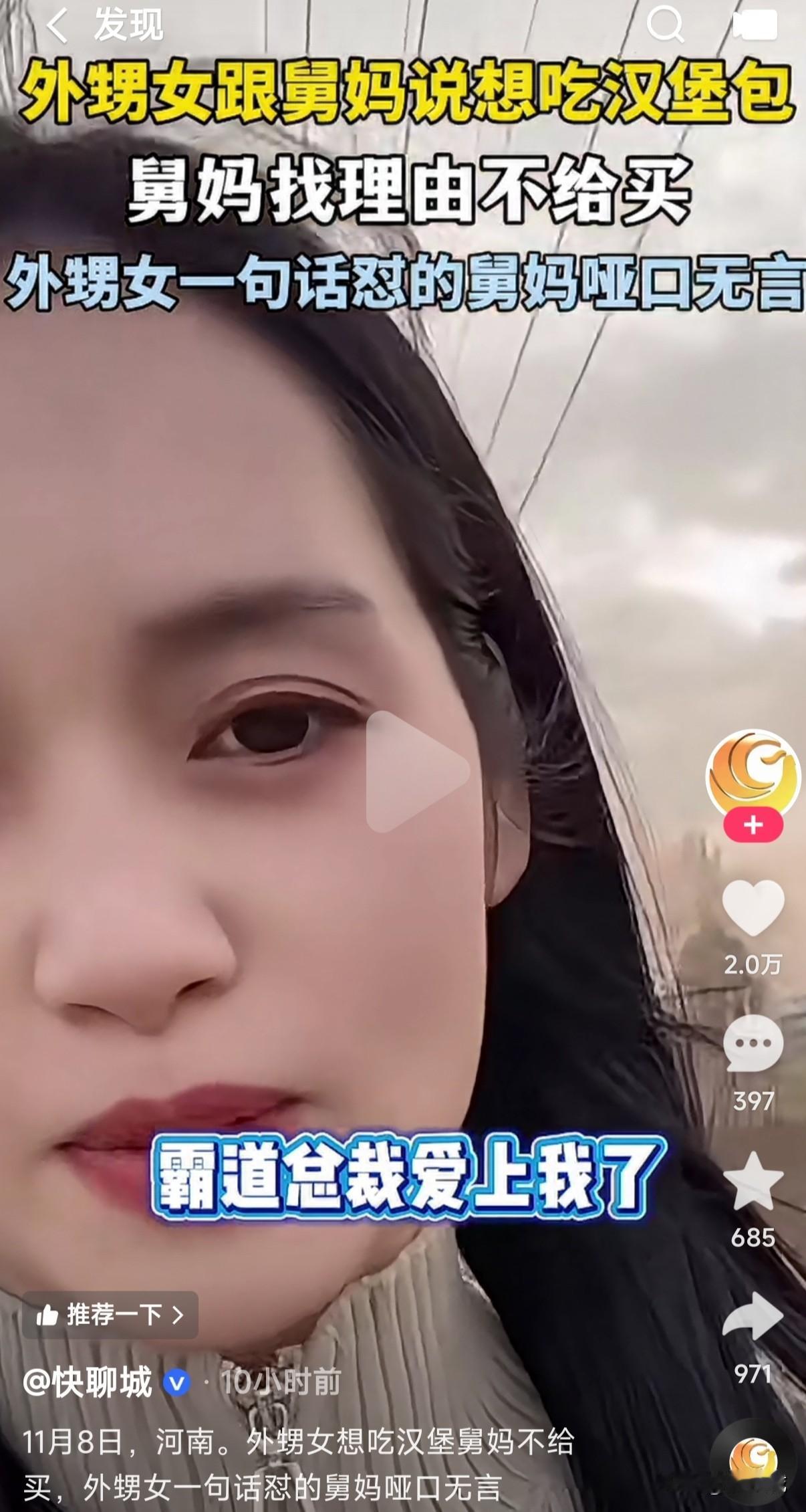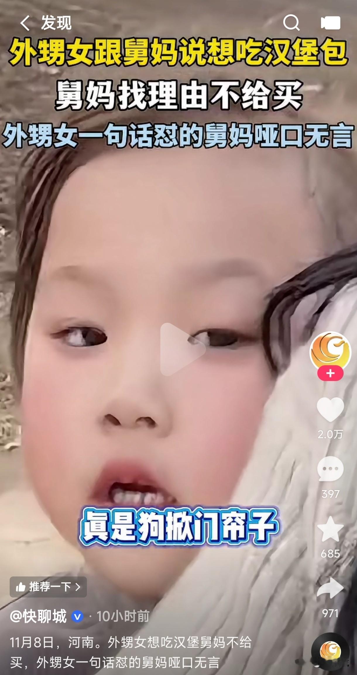 外甥女跟妗子说她想吃汉堡,妗子各种理由说辞不给她买,结果外甥女一句话怼的妗子哑口无言,外甥女说妗子是狗掀门帘子,全靠一张嘴。 不得不说现在这小孩的嘴真是会说,这些怼人的道理说的头头是道,她把妗子不给买汉堡的理由,居然用一句家常用语给总结的明明白白的,此时妗子也一脸无可奈何。 外甥女也是心直口快,这妗子不买就不买吗,还非要说什么等霸道总裁爱上她了,外甥女想要什么她给买什么,如果真到了那时候,她妗子连她舅都不要了,还会给她这个曾经的外甥女买东西,真是狗掀门帘子全靠一张嘴。
