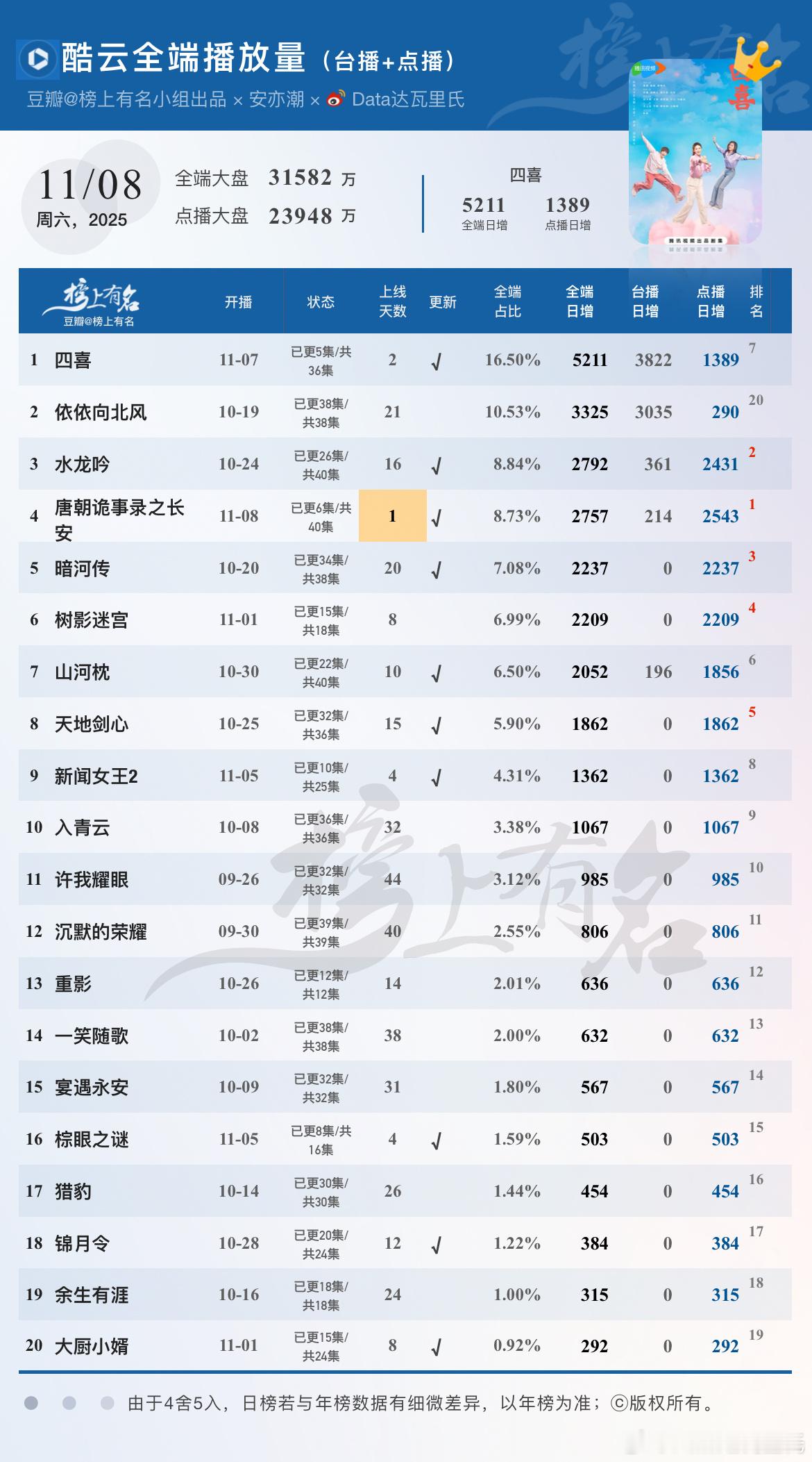 11.9酷云播放量🌴豆瓣榜上有名小组出品四喜全端日冠×3,点播1557唐朝诡
