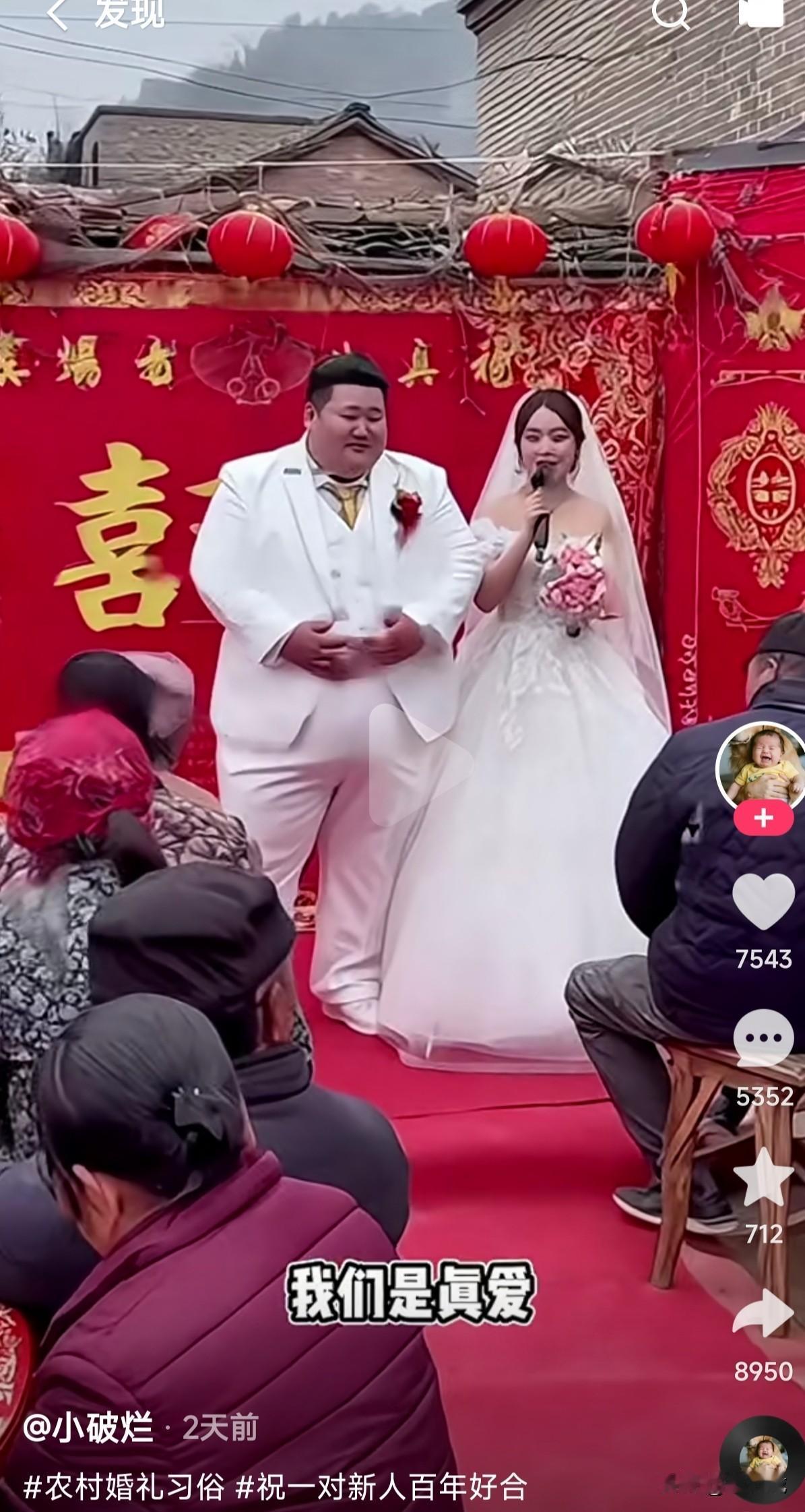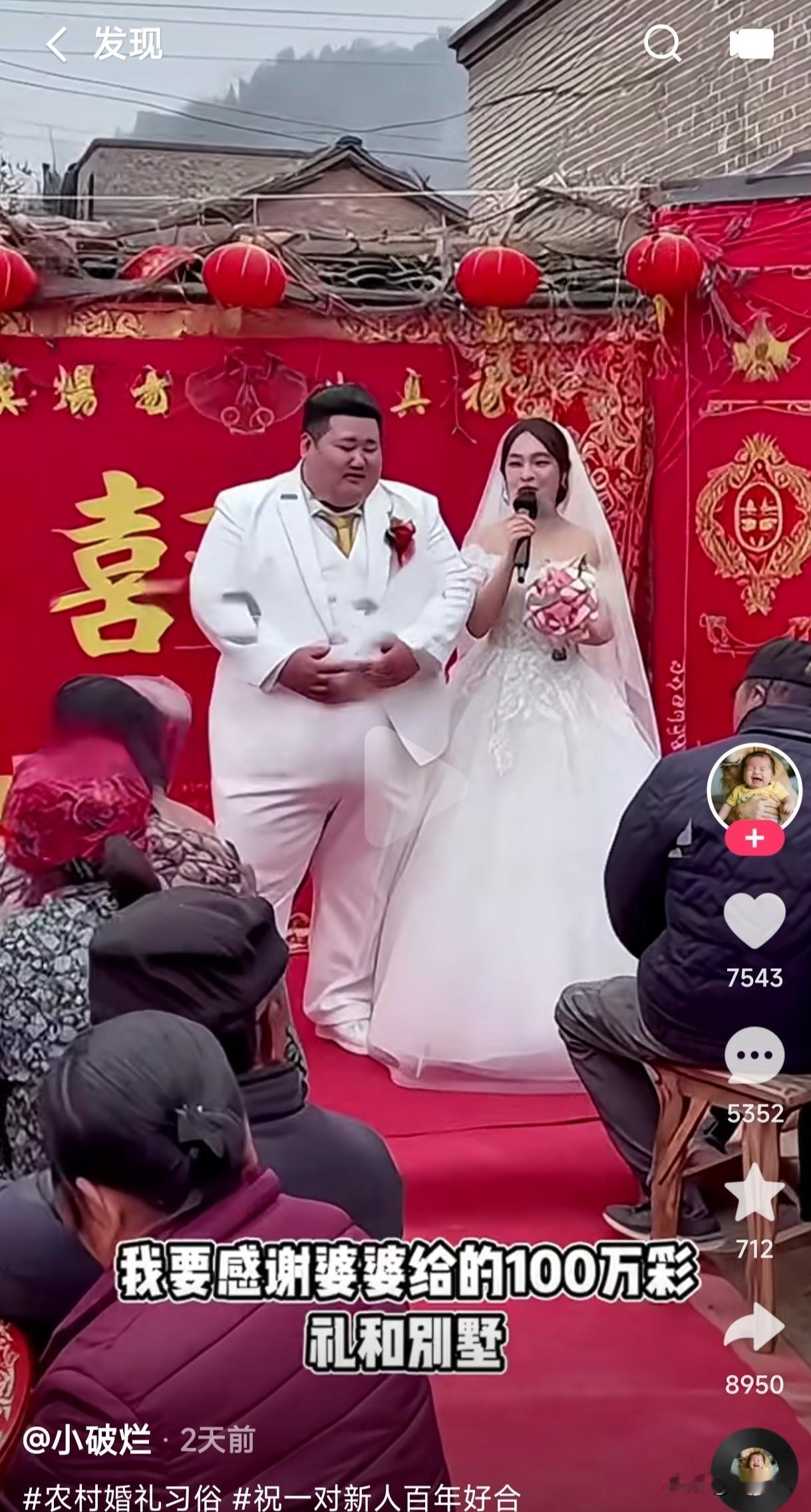 新娘在婚礼现场说他不是为钱嫁给老公的 她们彼此是真爱 她要感谢婆婆给的100万彩礼和别墅 让她嫁的安心过的舒心 真爱不是零彩礼不搞婚礼仪式吗 这究竟是什么操作 前脚说不是为了钱 后脚却说感谢100万的彩礼 由此看来男人只要有雄厚的钞能力 不管相貌长的如何 总归能娶到心仪的女人不是吗
