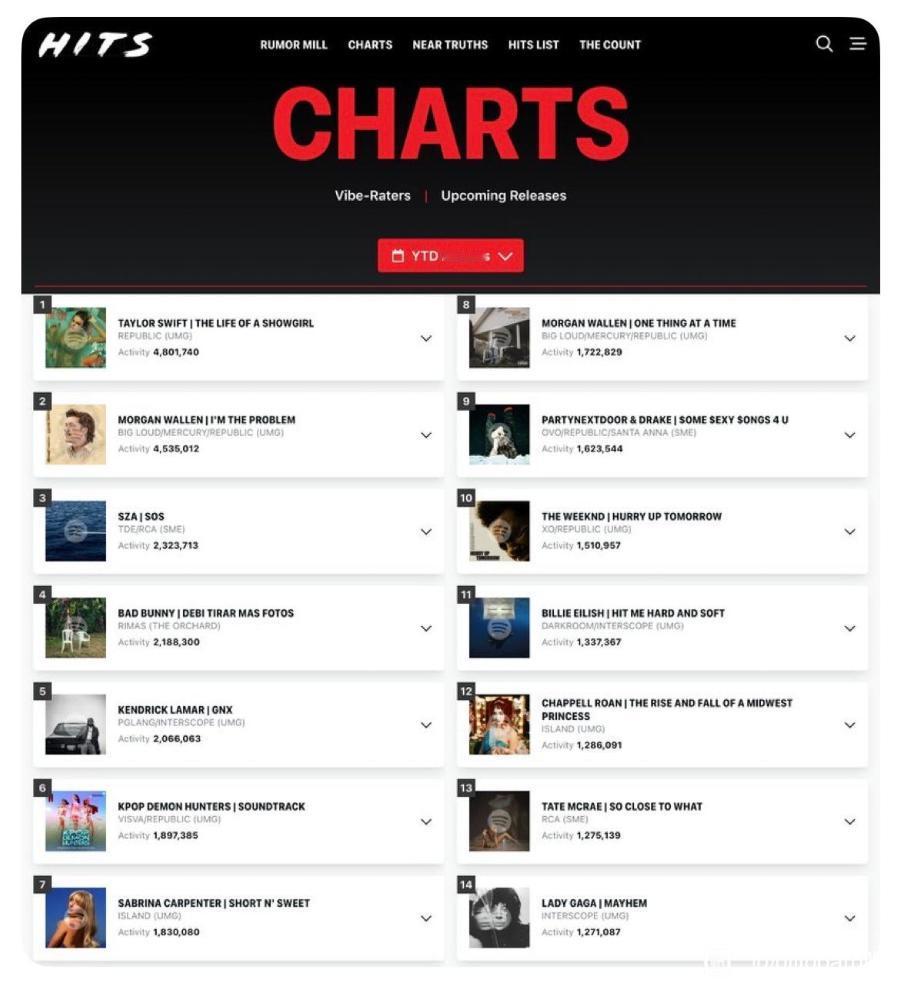 HDD 公布美国专辑年销量排行榜上,目前 Lady Gaga 的新专辑《MAYHEM》年销量为127万排名第十四。 比较引人注目的是,塔妹 Tate McRae 的专辑《So Close to What》和插排 Chappell Roan 的专辑《The Rise and Fall of a Midwest Princess》排名年度专辑销量的第十三名、第十二名。 虽然首周销量并不高。比如塔妹 Tate McRae《So Close to What》首周销量17.7万,不及 Lady Gaga 插排 Chappell Roan 的《The Rise and Fall of a Midwest Princess》厚积薄发,却纷纷凭借长尾效应累计销量超过了 Lady Gaga。 且两张专辑均无冠军单曲,靠长卖效应获得百万累计销量。 只能说超生代还是有自己的优势,优势就在于能够长线获得销量,细水长流。