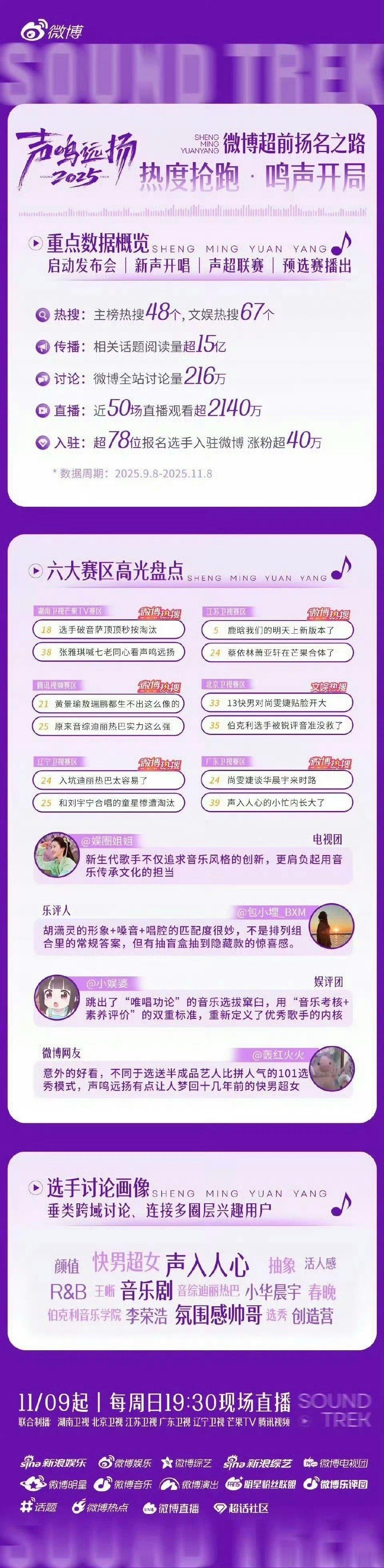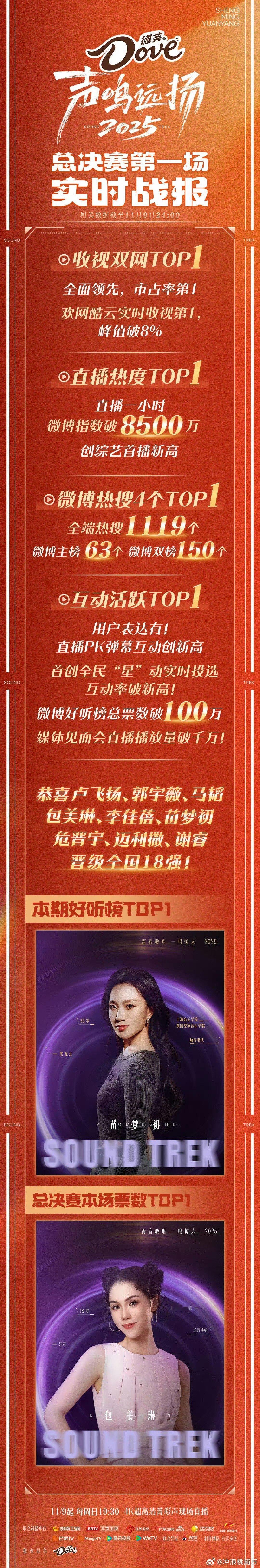 声鸣远扬直播收视率《声鸣远扬2025》全国总决赛第一场实时战报🈶,双网实时收视TOP1,微博热搜4个TOP1,直播热度TOP1,互动活跃TOP1,太牛啦!声鸣远扬