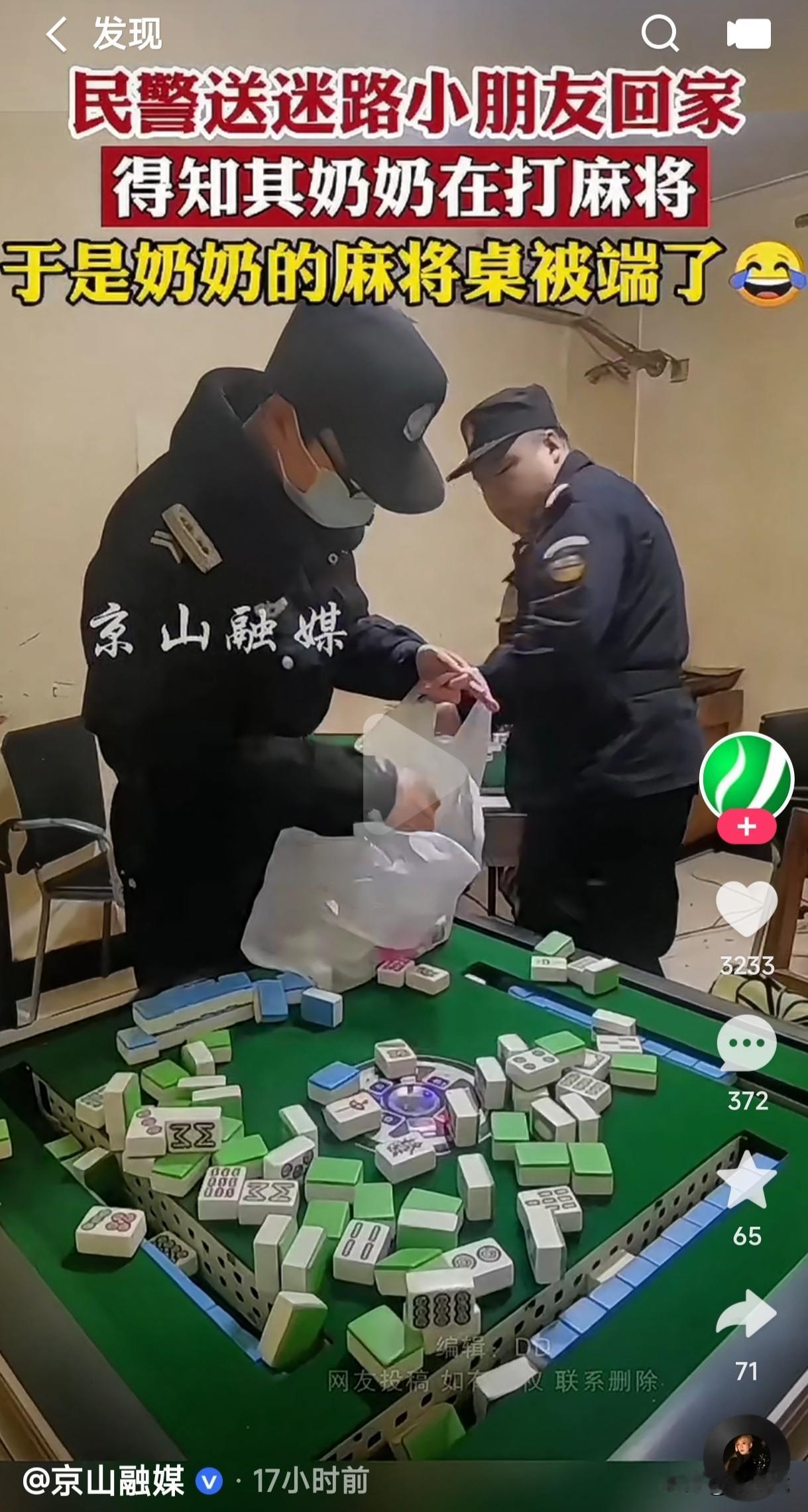 民警送迷路的小朋友回家,得知他奶奶在打麻将,于是她奶奶的麻将桌被端了,接下来儿媳妇是不是要骂娘了? 有多少人在看孩子的同时在打麻将,酿成的悲痛惨剧还不能引以为戒吗?难道麻将对于有些人来说就那么重要吗?这位老人在家打麻将,孩子走丢了都不知道,万幸的是被民警平安送回了家,如果真的出了什么意外,那她到时候是不是做任何事是不是都晚了? 民警送迷路孩子回家,顺带端了孩子奶奶的麻将,这可是一举两得的事,接下来是不是要爆发婆媳大战了,儿媳妇是不是就直接骂老公的娘了,让她在家看孩子,谁成想竟被民警送回了家,打麻将连孩子都忘了,这样的奶奶以后还敢让她看孩子吗?