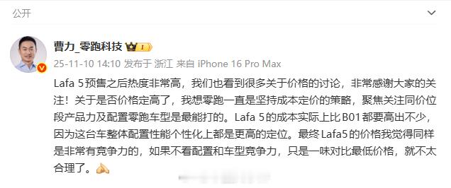 零跑高管回应Lafa5定价11月10日,零跑Lafa5 10.58-13.18万的预售价格发布后,零跑汽车高级副总裁发博回应关于Lafa 5定价问题。