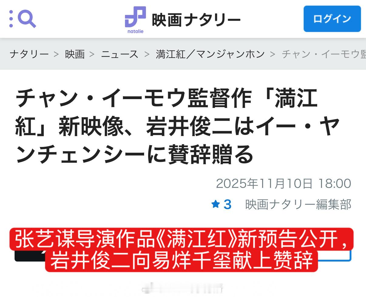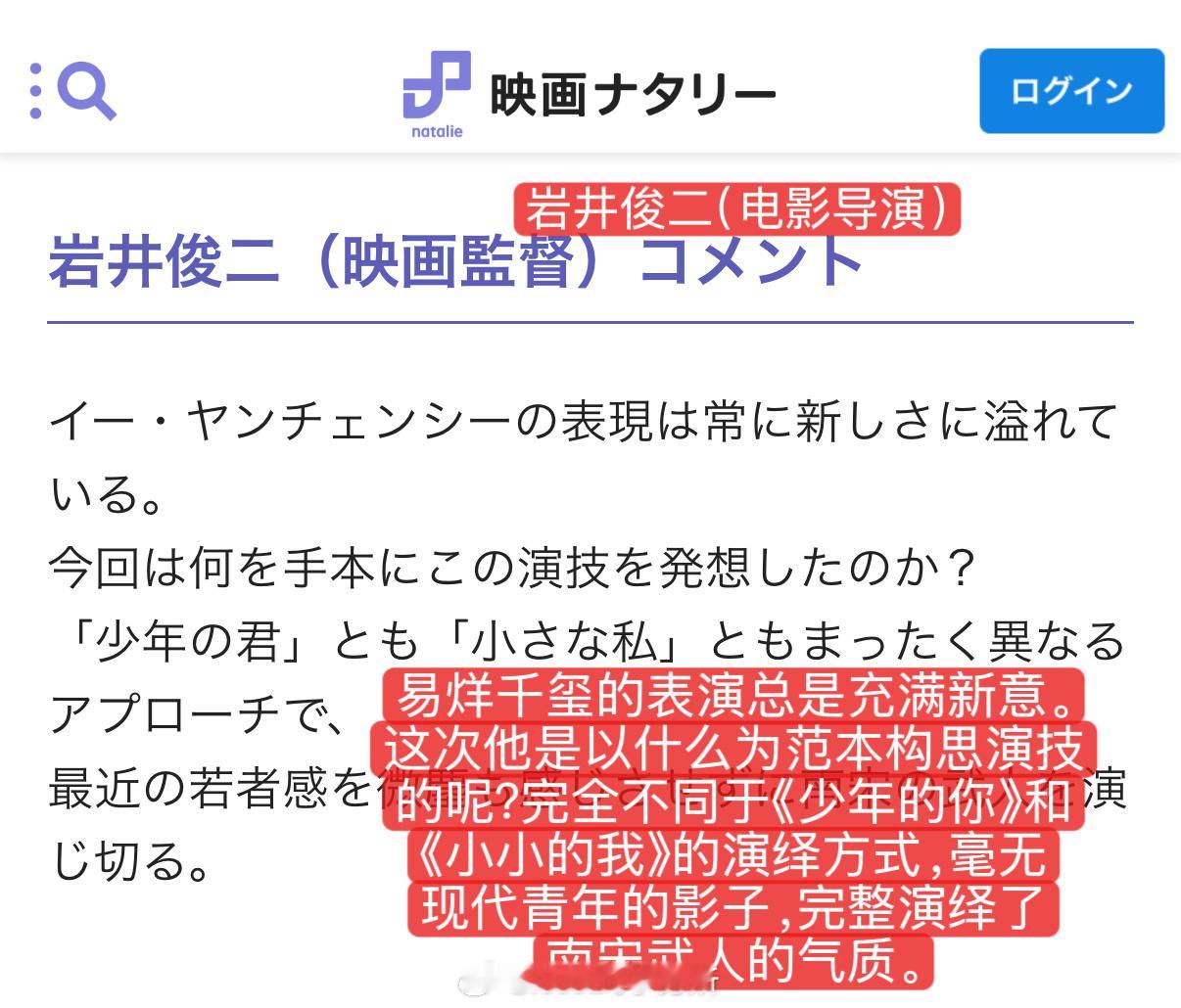 岩井俊二看完《满江红》后又夸易烊千玺了:完全不同于《少年的你》和《小小的我》的演绎方式,毫无现代青年的影子,完整演绎了南宋武人的气质。大导好喜欢看四的作品[笑cry]