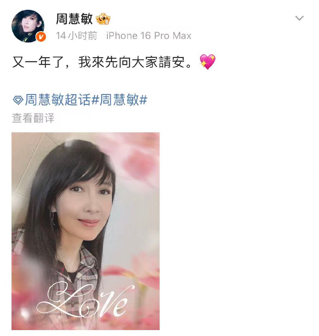 周慧敏58岁生日晒照58岁周慧敏状态 11月10日,58岁生日晒照,并配文:“又一年了,我先来向大家请安。💖”