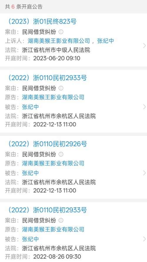 大皖新闻记者通过企查查平台查询后看到,湖南美猴王影业有限公司成立于2010年,注册资本1000万元,经营范围包括影视策划、影视文化项目投资;企业形象策划等,法定代表人和董事长为樊馨蔓,已被限制高消费。张纪中为董事、总经理。该公司有多条开庭公告,被告均是张纪中,最早一条时间在2021年,案由为民间借贷纠纷。