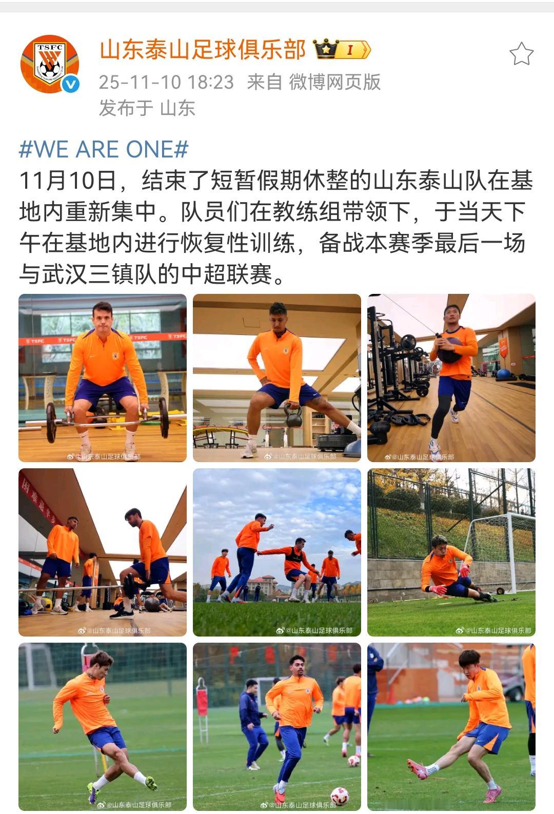 山东泰山队官宣,今天集结!瓦科续约了?11月10日,结束了短暂假期休整的山东泰山队在基地内重新集中。队员们在教练组带领下,于当天下午在基地内进行恢复性训练,备战本赛季最后一场与武汉三镇队的中超联赛。 据多家媒体人报道说瓦科续约了,不知真假,瓦科今年发挥出色,状态好,如果续约,实至名归,不能续约,也无妨,毕竟前场还有克雷桑、泽卡二人,泰山队还缺中场一个组织防守进攻全能球员。 韩鹏暂带队的全运会比赛,后卫队员主力史松宸受伤报销,依木兰,陈泽仕刚伤愈还得找状态,依木兰伤愈传球可以,但前锋状态不好,需提高。