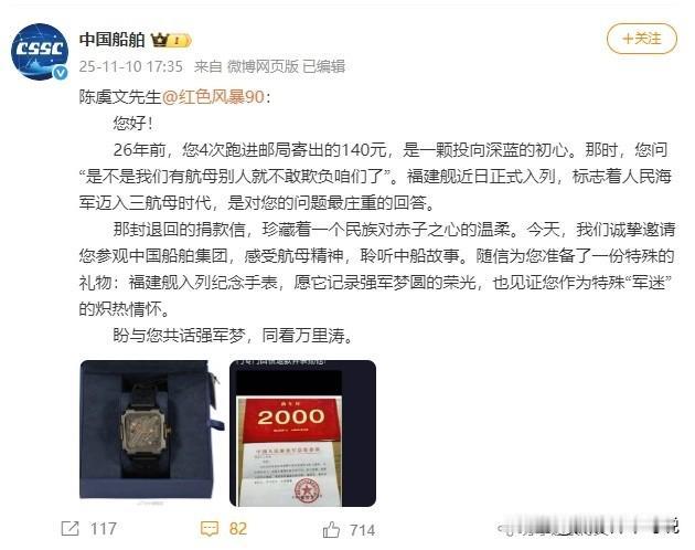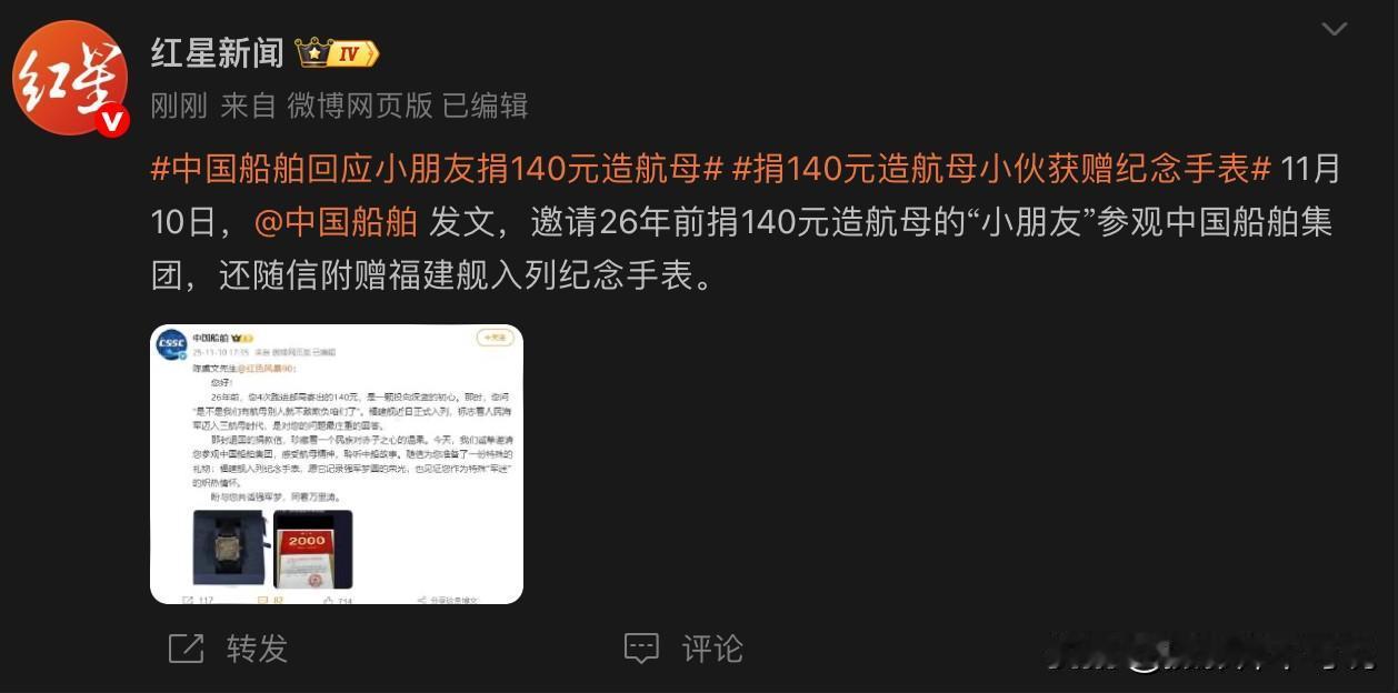 寻找1999年捐款140元造航母的陈虞文先生,当年他还是一位小朋友,如今26年过去了,不知道他怎么样了?今天,中国船舶发出一条博文,邀请这位分四次捐款140元的“小朋友”,参观中国船舶集团,感受航母精神,聆听中船故事。并赠送一只福建舰入列纪念手表。说实话,今天被这位“小朋友”的故事给感动了,要知道那时候的140元也不算是小数目,尤其是对一名孩子而言。现如今这位“小朋友”的梦想已经实现,不知道他收到了这份特殊的邀请了吗?