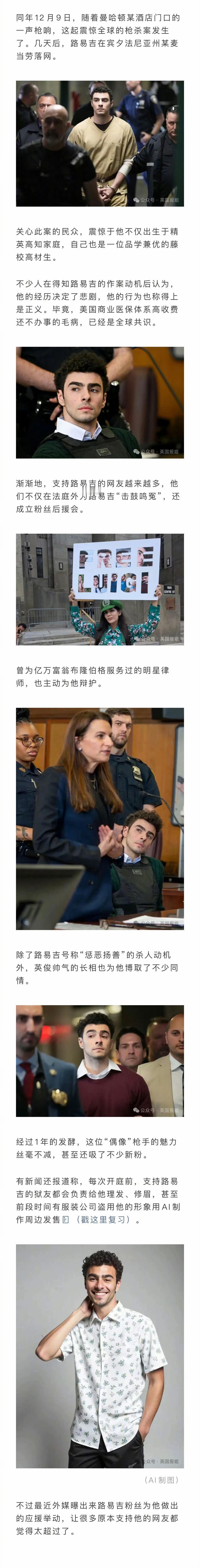 当地时间2024年12月4日早,布莱恩·汤普森在美国纽约曼哈顿中城区希尔顿酒店外遭遇枪击,胸部中枪后经抢救无效死亡 。2024年12月9日,嫌疑人路易吉·曼焦内被捕。但这位犯罪嫌疑人,因为帅气的长相,入狱以后还有越来越多的拥趸追随他,粉丝们成立了专门的应援团队,给他打赏。他在监狱中可以享受玩电脑、大声播放歌曲,出庭日还有粉丝专门去给他化妆,享受明星般的待遇。不仅待遇高,账户上随时都有粉丝打赏进账。按照他这吸金能力,如果不死,25年后出狱说不定会是一个富翁,比他正常毕业上班还赚,简直匪夷所思。
