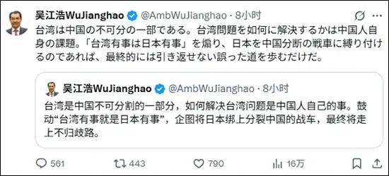 据日本时事通迅社今天(11月10日)报道,日本首相高市早苗今天在国会为其此前关于“存立危机事态”可适用“台湾有事”的言论进行澄清和“降温”。高市早苗称:“这只是针对最坏情况的假设性回答,并不意味着日本政府的一贯立场发生改变。今后将避免就具体案例做出类似表述。” 高市早苗的狂妄言论也受到日本政界的广泛批评,前首相鸠山由纪夫、野田佳彦称其言论极端荒谬、极其危险。但是高市早苗今天的表态,没有半点悔改之意,她依然坚持“台湾有事就是日本有事”的荒谬主张,只是后悔“不应该直接说出来”。台湾是中国领土不可分割的一部分,如何解决台湾问题是中国人自己的事,与日本没有半毛钱的关系,如果日本武力介入,只能是自取灭亡。 针对高市早苗声称“若台湾有事,可能构成日本的存亡危机,则不排除动用武力”的言论,中国驻日本大阪总领事薛剑的回应直截了当,“只能毫不犹豫地斩掉那擅自闯入的肮脏头颅”(图3)!也就是说对于来犯之敌,我们只能完全彻底地消灭之。 现在的问题是,中国终将要统一也必然要统一,这是大势所趋,人心所向,届时就让高市早苗带着一些日本的狂妄之徒“停止生存”吧!