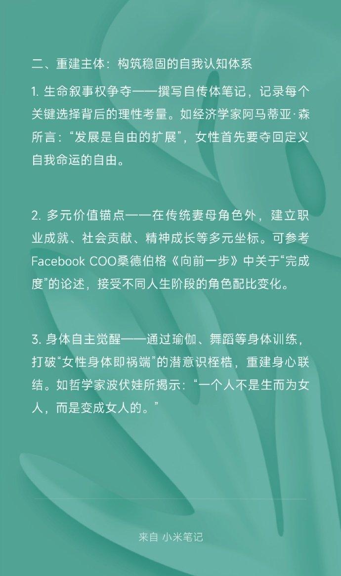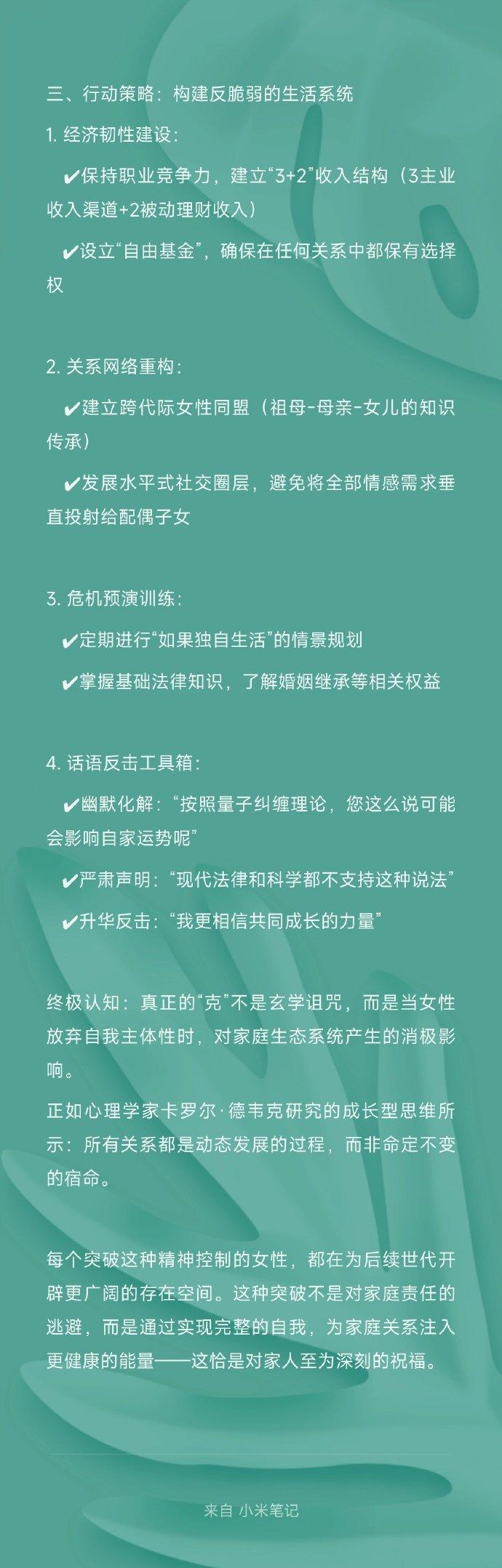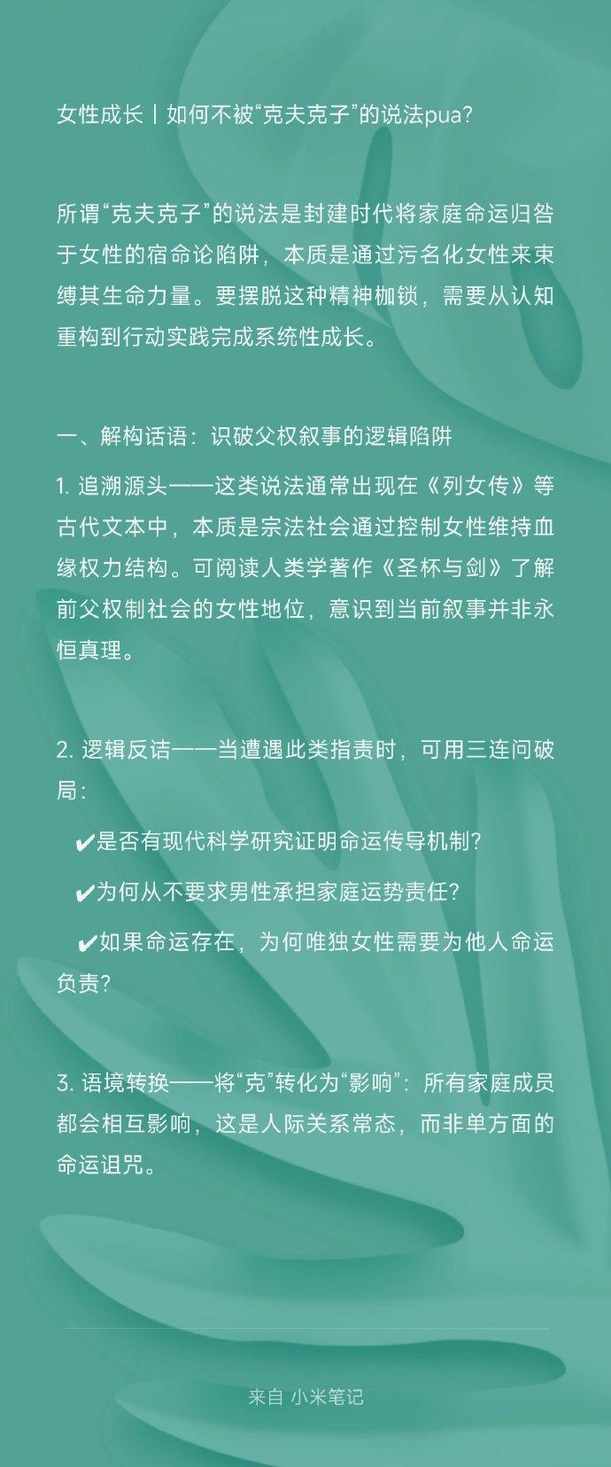 女性成长|如何不被“克夫克子”的说法pua? 所谓“克夫克子”的说法是封建时代将家庭命运归咎于女性的宿命论陷阱,本质是通过污名化女性来束缚其生命力量。要摆脱这种精神枷锁,需要从认知重构到行动实践完成系统性成长。 一、解构话语:识破父权叙事的逻辑陷阱 1. 追溯源头——这类说法通常出现在《列女传》等古代文本中,本质是宗法社会通过控制女性维持血缘权力结构。可阅读人类学著作《圣杯与剑》了解前父权制社会的女性地位,意识到当前叙事并非永恒真理。 2. 逻辑反诘——当遭遇此类指责时,可用三连问破局: ✔是否有现代科学研究证明命运传导机制? ✔为何从不要求男性承担家庭运势责任? ✔如果命运存在,为何唯独女性需要为他人命运负责? 3. 语境转换——将“克”转化为“影响”:所有家庭成员都会相互影响,这是人际关系常态,而非单方面的命运诅咒。 二、重建主体:构筑稳固的自我认知体系 1. 生命叙事权争夺——撰写自传体笔记,记录每个关键选择背后的理性考量。如经济学家阿马蒂亚·森所言:“发展是自由的扩展”,女性首先要夺回定义自我命运的自由。 2. 多元价值锚点——在传统妻母角色外,建立职业成就、社会贡献、精神成长等多元坐标。可参考Facebook COO桑德伯格《向前一步》中关于“完成度”的论述,接受不同人生阶段的角色配比变化。 3. 身体自主觉醒——通过瑜伽、舞蹈等身体训练,打破“女性身体即祸端”的潜意识桎梏,重建身心联结。如哲学家波伏娃所揭示:“一个人不是生而为女人,而是变成女人的。” 三、行动策略:构建反脆弱的生活系统 1. 经济韧性建设: ✔保持职业竞争力,建立“3+2”收入结构(3主业收入渠道+2被动理财收入) ✔设立“自由基金”,确保在任何关系中都保有选择权 2. 关系网络重构: ✔建立跨代际女性同盟(祖母-母亲-女儿的知识传承) ✔发展水平式社交圈层,避免将全部情感需求垂直投射给配偶子女 3. 危机预演训练: ✔定期进行“如果独自生活”的情景规划 ✔掌握基础法律知识,了解婚姻继承等相关权益 4. 话语反击工具箱: ✔幽默化解:“按照量子纠缠理论,您这么说可能会影响自家运势呢” ✔严肃声明:“现代法律和科学都不支持这种说法” ✔升华反击:“我更相信共同成长的力量” 终极认知:真正的“克”不是玄学诅咒,而是当女性放弃自我主体性时,对家庭生态系统产生的消极影响。 正如心理学家卡罗尔·德韦克研究的成长型思维所示:所有关系都是动态发展的过程,而非命定不变的宿命。 每个突破这种精神控制的女性,都在为后续世代开辟更广阔的存在空间。这种突破不是对家庭责任的逃避,而是通过实现完整的自我,为家庭关系注入更健康的能量——这恰是对家人至为深刻的祝福。[笑][笑][笑]