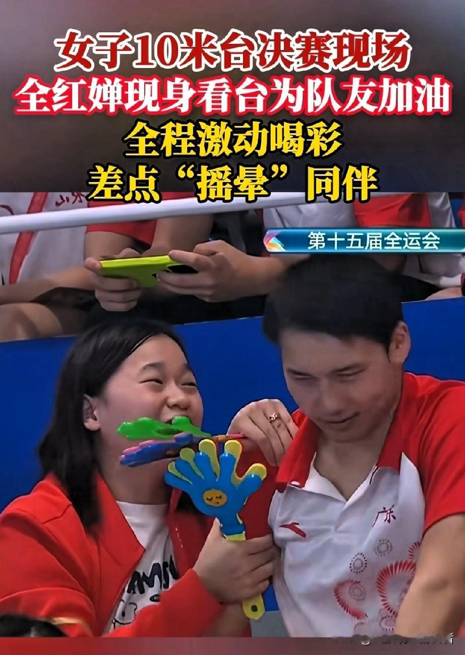 谁都得服全红婵! 就算因伤退赛当观众,投入度也直接拉满~ 今晚全运会10米台决赛,没能登场的全红婵坐在观众席,全程紧盯赛场。当小师妹谢佩玲跳出高分时,她瞬间没了“表情管理”,激动地使劲摇晃身边的队友,眼里的光藏都藏不住,那股纯粹的开心隔着屏幕都能感受到! 这份兴奋太好懂了——若不是伤病困扰,她本该在跳台上为省队冲锋陷阵,如今自己没能上场,看到师妹亮眼发挥、助力广东队在10米台双人及个人项目均获第五,这份替队友骄傲的心情,比自己夺冠还真切。 希望全红婵好好养伤,早日找回最佳状态,在接下来的大赛中再展“水花消失术”!你最期待她伤愈后冲击哪个赛事的冠军呀?