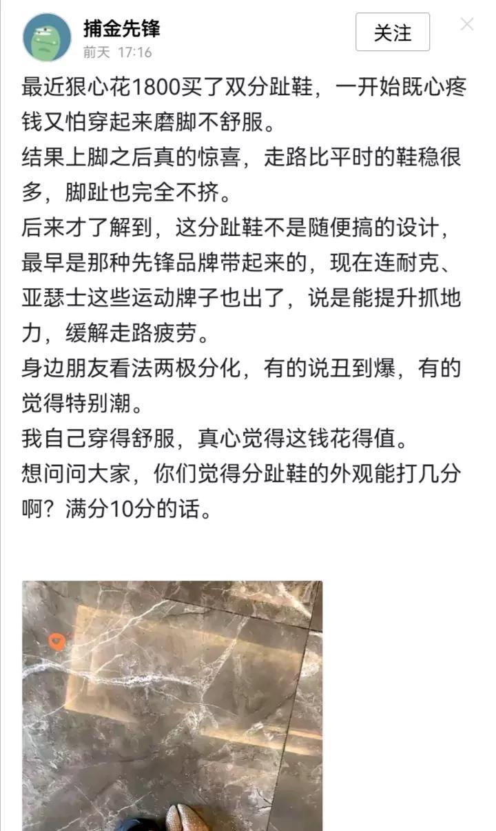 这张分趾鞋的照片[捂脸],一天之内竟然刷到3个小作文,从自己花1800元买的,到男朋友给买的,还有闺蜜不穿了送的[泪奔]。 看来,随便下载个图,然后看图说话、张嘴瞎编就好了……