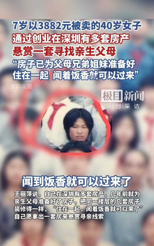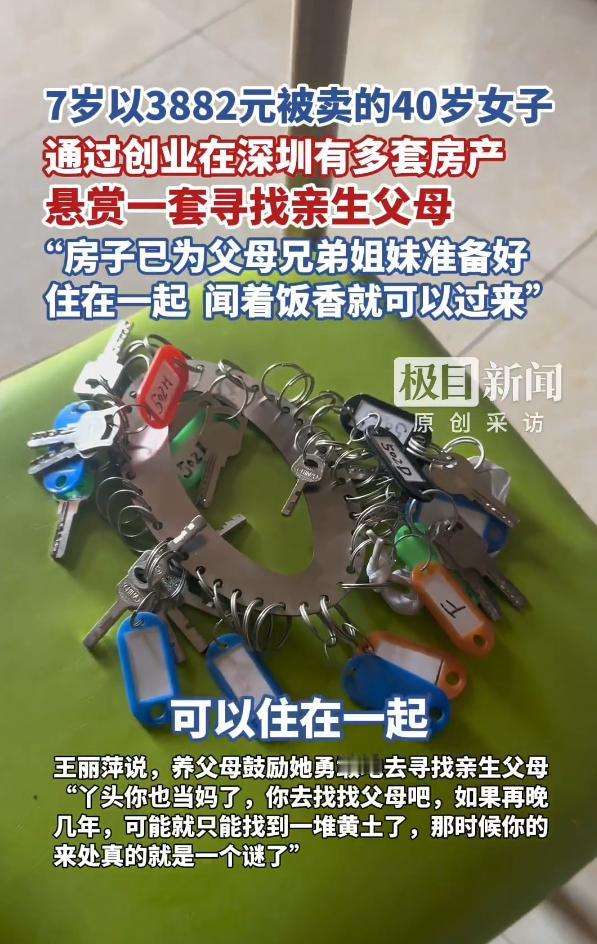 深圳女子悬赏一套房寻亲。 她已经为分离三十余年的亲生父母准备好了住房,并愿以一套房作为悬赏,只为求得一个团圆的机会。 王丽萍说她7岁的时候被人贩子从亲生父母身边带走,最终去到福建泉州的一户人家。 在她的记忆中,原生家庭的房子是石头和木头的混合结构,家中有姐姐,还有一个兄弟。 她更记得,父亲砍柴受过伤,而爷爷奶奶的家就在他们对面。 根据养父回忆,他们当时花了3882元,初到福建的时候,王丽萍能说一口非常标准的普通话,这暗示着她的原生家庭可能来自与福建不同的地方。 促使她最终鼓起勇气、公开寻亲的,是双重情感的驱动。一方面,她自己成为了母亲,角色的转变让她对亲情有了更深刻的理解与渴望,她在视频中说到想吃亲生父母做的饭。 另一方面,养父母一家展现出令人动容的开明与支持。他们鼓励她:你也当妈了,你去找找父母吧,如果再晚几年,可能就只能找到一堆黄土,你的身世真的就是一个谜了。 这份超越血缘的关爱,成为了她寻亲路上最温暖的后盾。 事件发生后,有很多位寻亲家长和热心人士介入帮助。 并且她已经主动到公安机关采血,将DNA数据录入全国打拐DNA数据库。这是目前认亲科学、权威且成功率最高的途径。 现在,王丽萍还在等着。她准备好了房子,更准备好了那颗期盼团圆的心。 她最想做的,不过是吃上一顿亲生父母做的、热乎乎的家常饭。 这顿饭,她已经等了三十多年。