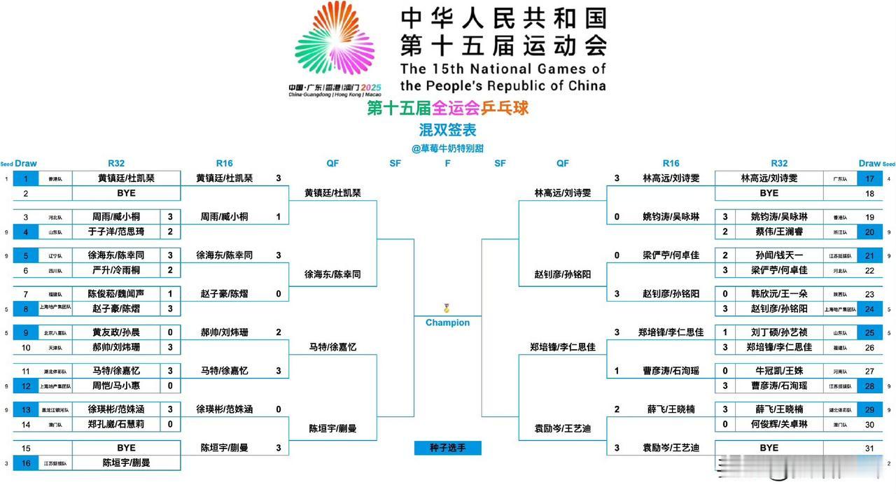 混双8强全部产生,1/4决赛名单公布! 第十五届全国运动会·乒乓球项目 混双1/4决赛:11.11 1.黄镇廷/杜凯琹(香港队)🆚徐海东/陈幸同(辽宁队) 2.马特/徐嘉忆(湖北体彩队)🆚陈垣宇/蒯曼(江苏挺拔队) 3.林高远/刘诗雯(广东队)🆚赵钊彦/孙铭阳(上海地产集团队) 4.郑培锋/李仁思佳(福建队)🆚袁励岑/王艺迪(辽宁队)