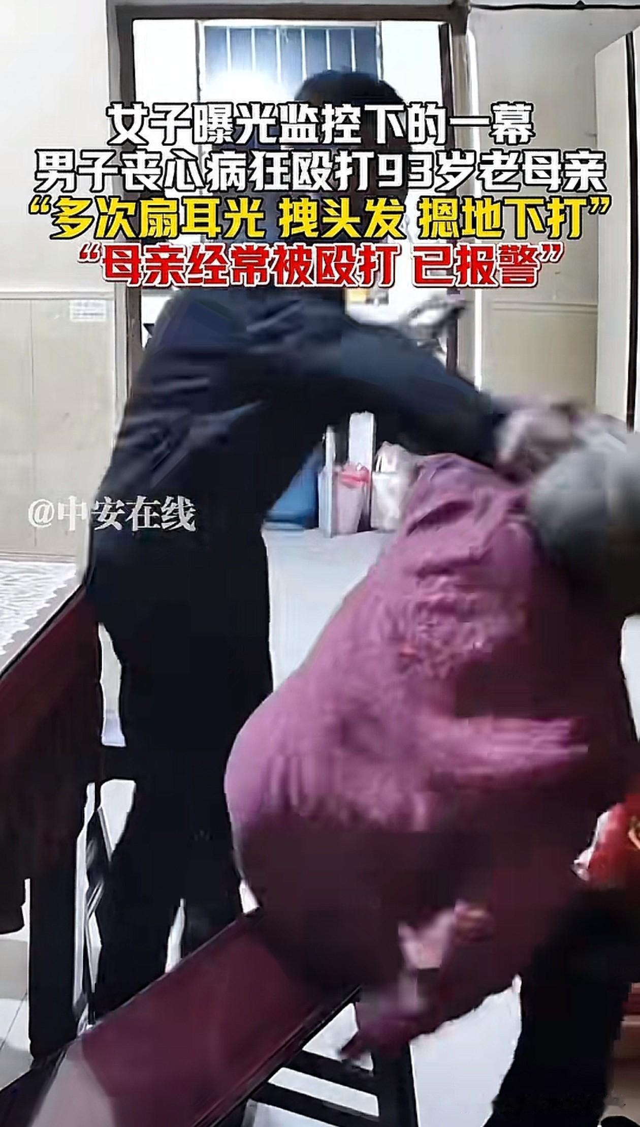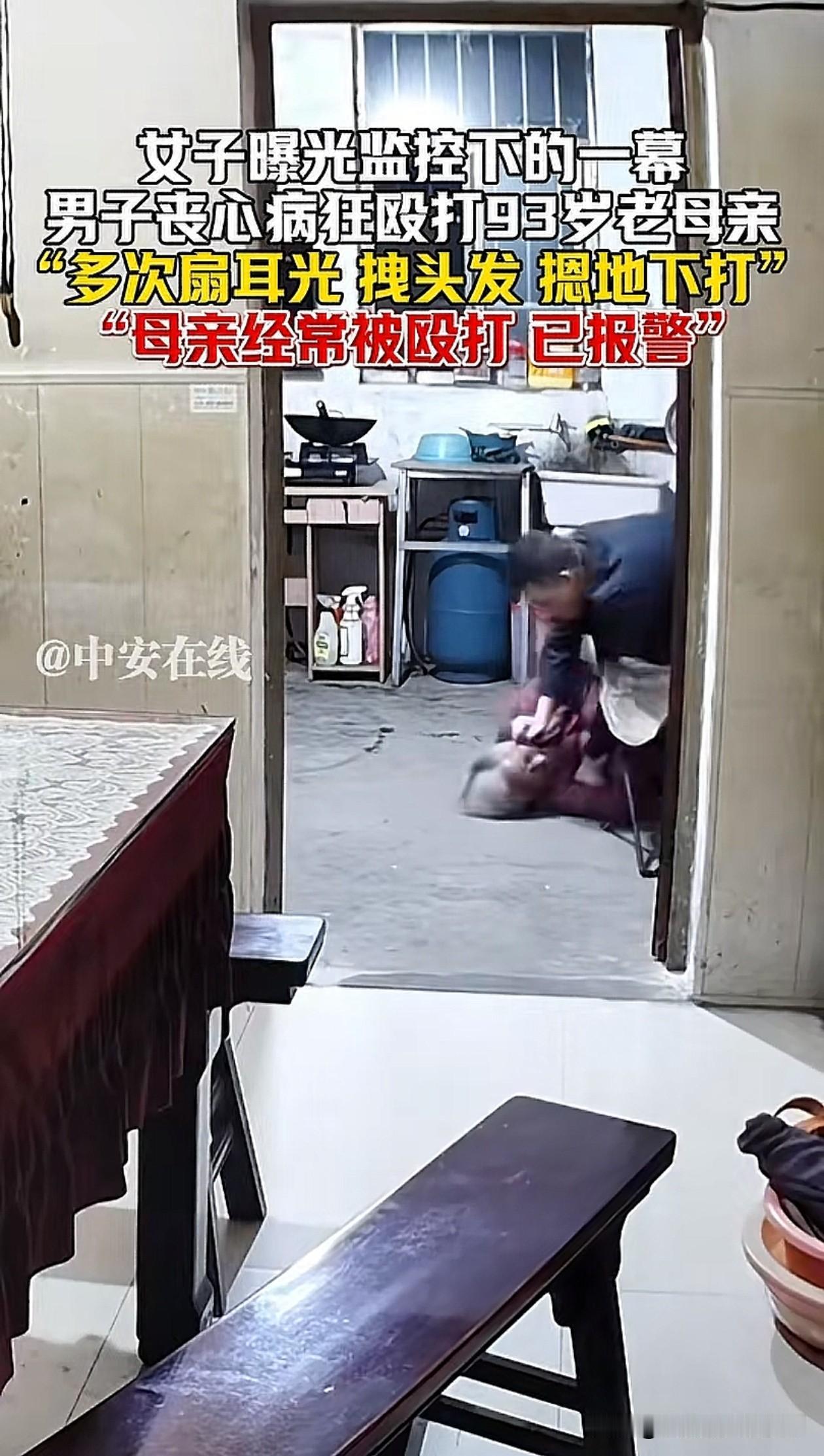 说真的,今天刷到一个视频,看完让人彻夜难眠,太难受了! 江苏,男子和93岁母亲争吵,男子居然一巴掌重重的打向了母亲,随后又不顾母亲的哀嚎求饶,抓起头发不断摇晃,可能这样还不够发泄他心中的情绪,又多次对母亲拳打脚踢。 随后,看到母亲走向了厨房,男子又冲进去把人按倒在地殴打,看到自己母亲躺在地上一动不动,男子却没有丝毫歉意,而是淡定的回到桌子前吃起东西。 虽然不知道前因后果,但作为儿子怎么能对93岁母亲做出这样的事,说心里话我可以和父母吵架,但根本不会有动手的念头和想法。 真不知道男子怎么狠心下的去手,妈妈给了他生命,他却想要母亲的生命,这样的人不配当人,建议q毙吧!