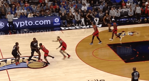图8庄神外出夹击CC,弱侧底角的马克西直接斜刺里杀出抢断CC给顺下杜伦的传球,随即快攻一条龙暴扣。