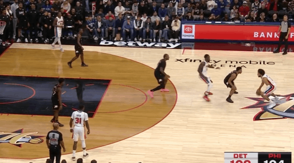 图6交球后佯装为格莱姆斯设置无球掩护,随即迅速转身借助庄神的“Away Screen”上提,接球后立即出手三分。
