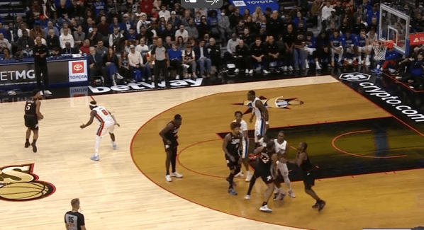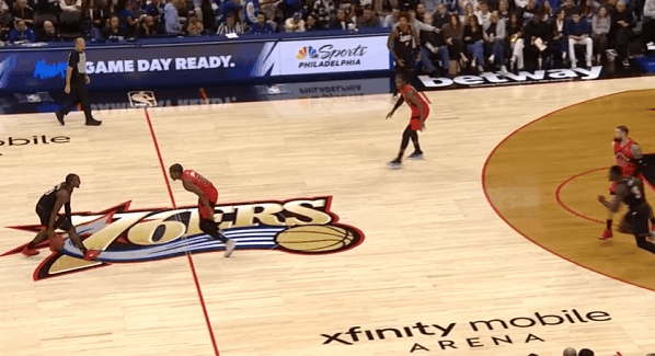 图4推过半场后抓猛龙防守立足未稳发起早期进攻,“in&out”启动右路突破,佯装分给45°的VJ误导刷卡的奎克利,见奎克利没有大范围回扑后,迅速合球撩起手臂起步,右手挑篮打进。