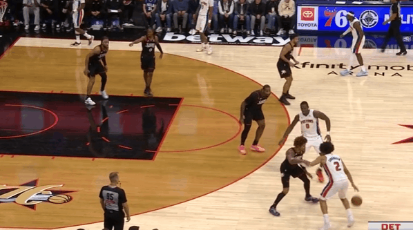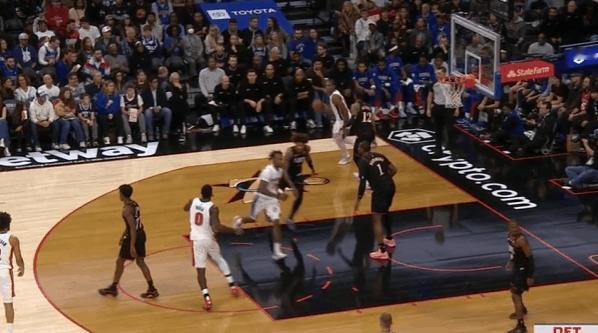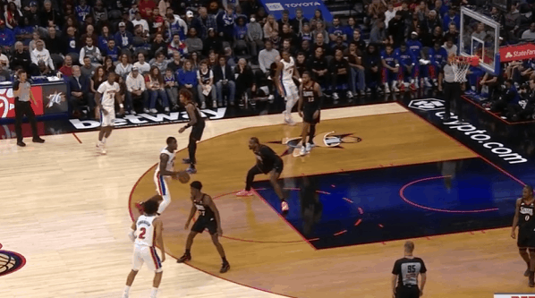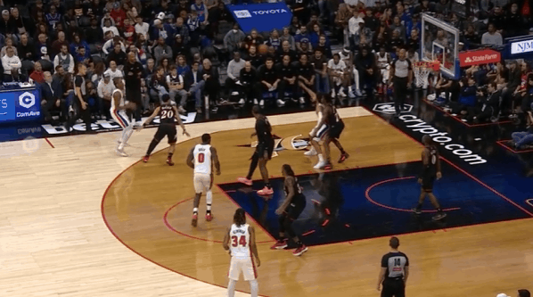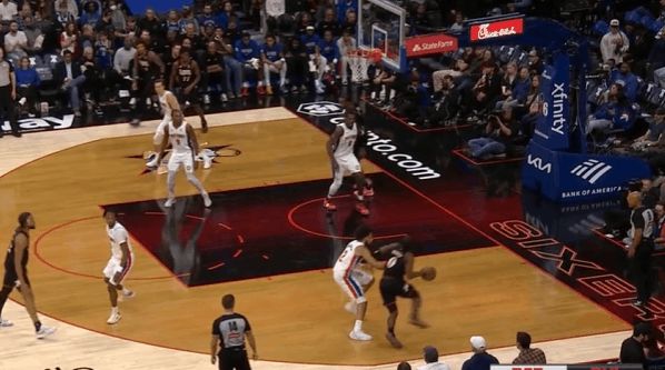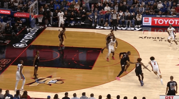 图6CC和杜伦的边路挡拆,庄神给夹击,杜伦短顺下处理多打少:面对回收垫防的沃特福德背转身衔接上篮终结。