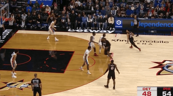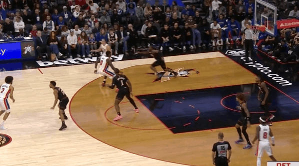 图5CC低位拿球的瞬间吸引了3人夹击,杜伦空接接应,起跳对抗顶着马克西接到球后,迅速二次起跳双手扣篮。
