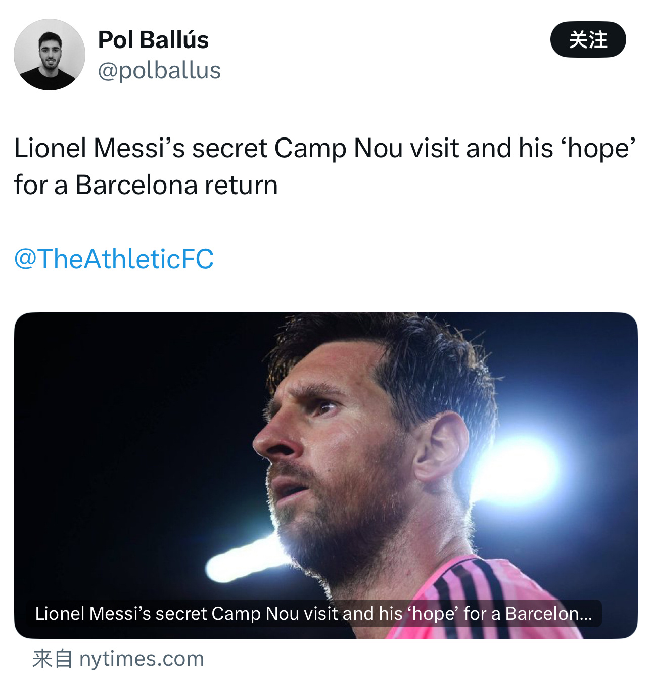 据The Athletic巴萨方面的记者Pol Ballus撰文表示,梅西此次夜访诺坎普,巴萨方面无人参与其中,对此毫不知情。