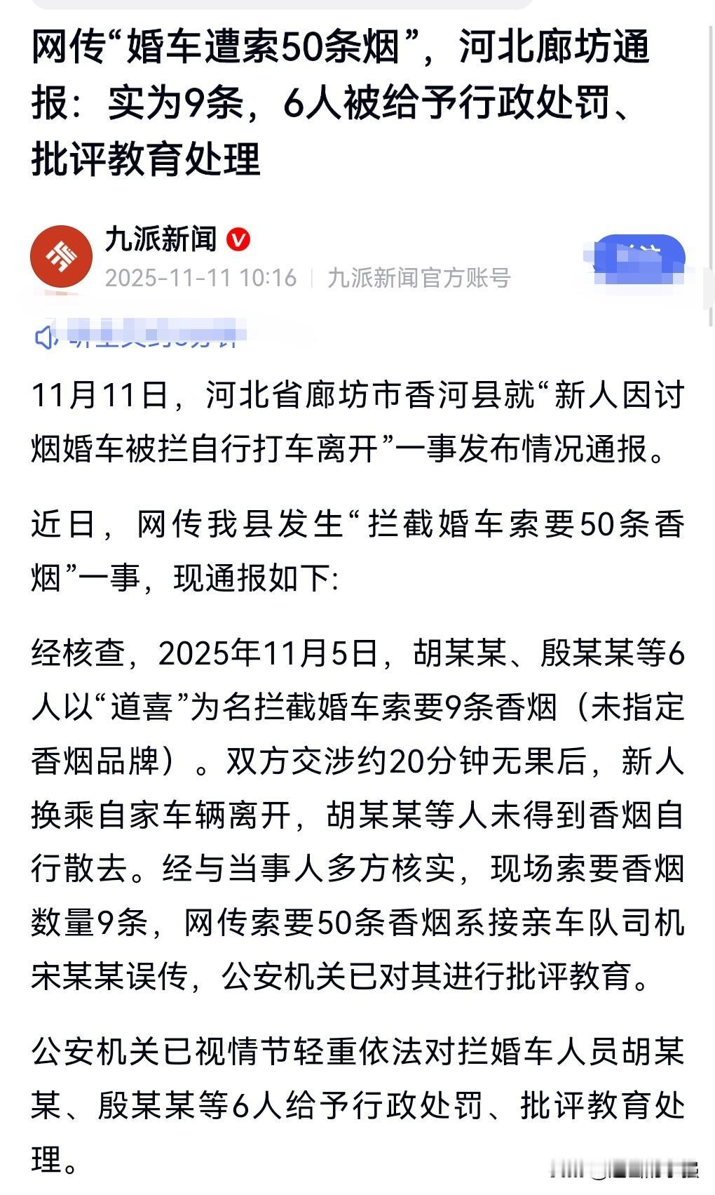 网上的谣言太多了,一定要严惩造谣者。 此前网传有人拦住婚车要50条烟。 结果新人打车走了。 11月11日消息,并不是要50条烟,而是要9条烟。 所以要严惩那个造谣说50条烟的人。 但是要九条烟也很离谱了,新郎新娘又不欠他们的烟,凭什么找新郎新娘要烟,这些要烟的人也不是什么善类。 跟敲诈勒索没什么两样。