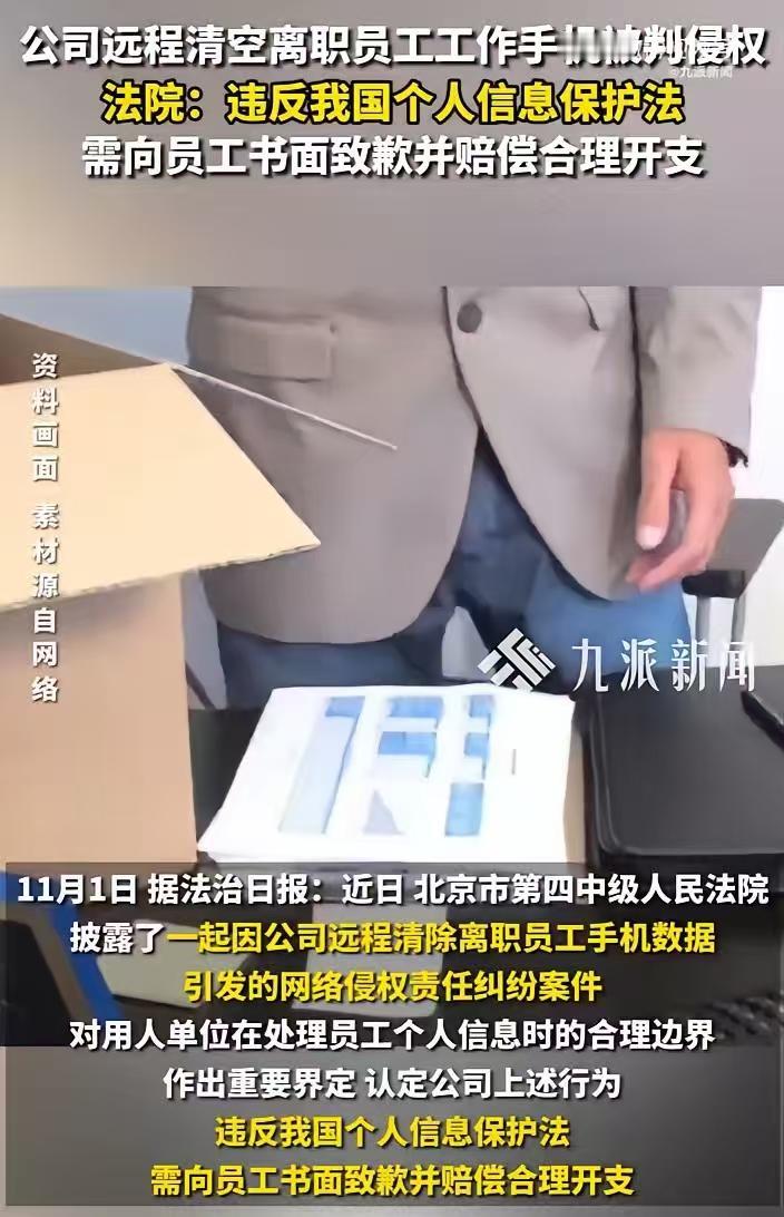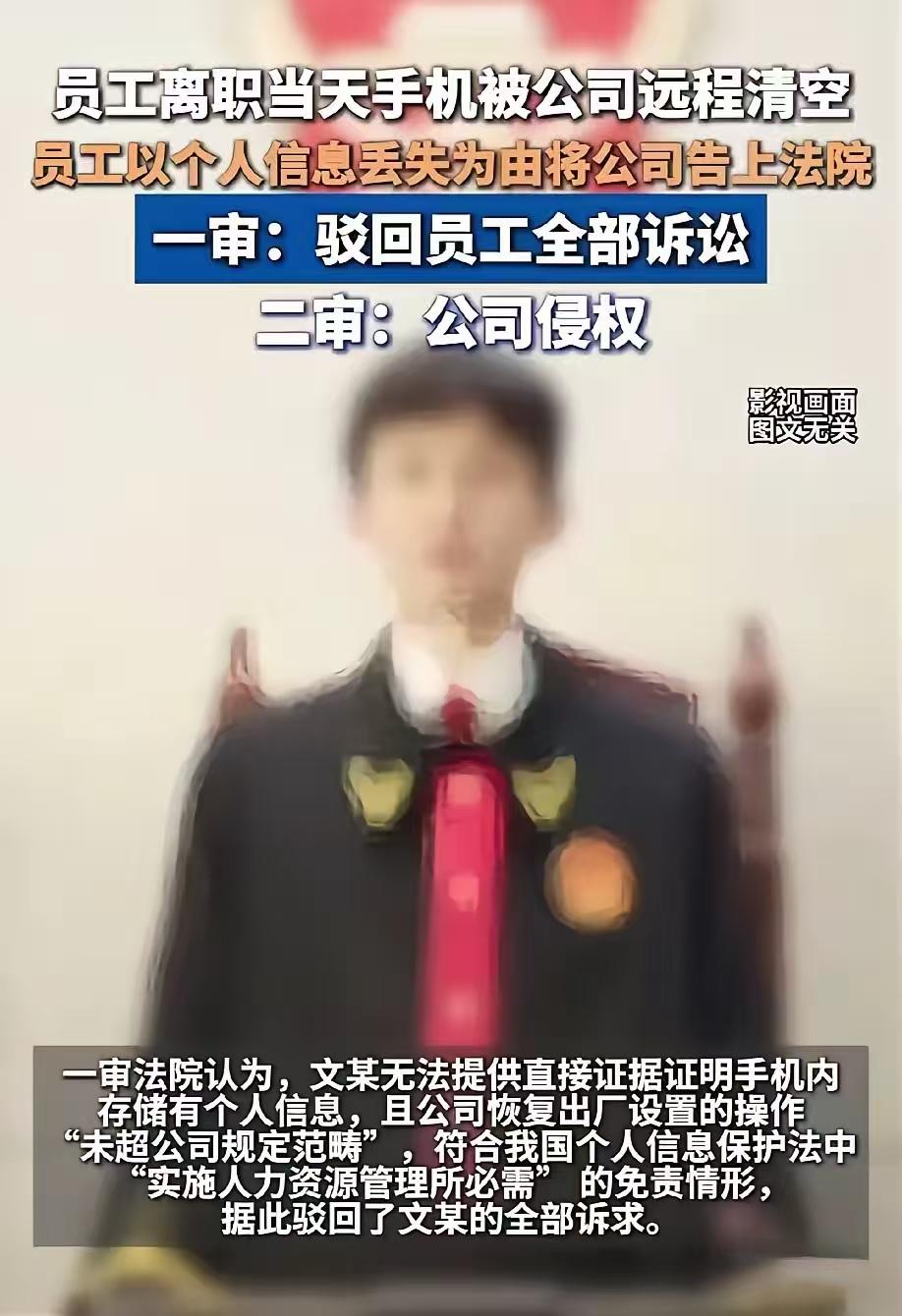 员工离职当天,被公司远程清空手机信息,法院终审判公司致歉赔偿。 北京,文先生给公司发了份离职邮件就潇洒离去,没想到,当天下午,他的手机就被公司远程清空,恢复了出厂设置,里面的所有信息被清理一空。 太寒心了,离职当天,公司直接远程一键清空工作手机,连句提醒都没有,文先生当场傻眼,我的通讯录,聊天记录全没了! 文先生气不过,把公司告上法庭,公司辩驳,手机是公司配发的工作设备,有权按照公司政策清理。法院经过两审,给出完全不同的判决。 文先生感到职业发展受限,最终决定辞职,并寻找新的平台。 2023年3月13日,他正式向公司发送了离职邮件,期待着完成交接后,轻松开始下一段职业生涯。 然而,就在当天下午,他的手机突然出现黑屏,并自动重启,等到屏幕重新亮起时,他发现所有数据都被清空,手机竟然恢复到了出厂设置。 里面的通讯录、聊天记录、照片、文件以及一些珍贵的家庭视频,全部消失无踪。 文先生立即联系公司询问情况,得到的解释是,这部手机是公司配发的工作设备,根据内部政策,员工离职后公司有权进行清理。 文先生十分气愤,因为尽管手机是公司提供的,但日常使用中,他存储了许多个人信息,公司未经任何通知就远程清空所有数据,这让他觉得自己的权益受到了严重侵害。 他反复与公司沟通,希望对方能给出合理解释,或帮助恢复部分重要信息,但公司态度坚决。 并强调,设备属于公司财产,且文先生曾签署过设备管理协议,协议中规定手机只能用于业务用途,不应存放私人内容。 由于协商无果,文先生决定通过法律途径维权,将咨询公司告上法庭,要求对方承担侵权责任。 庭审中,公司方坚持认为手机是公司资产,清理行为符合内部规定,并指出,文先生无法证明手机中存有个人信息,因为数据已被清空,他无法提供任何证据。 根据《民事诉讼法》第六十七条的规定,当事人需对自己提出的主张提供证据。 据此一审法院认定,公司的操作未超出政策范围,驳回了文先生的全部诉求。 文先生对一审判决感到失望,但他坚信自己的权利受到了侵犯,于是提起上诉。 二审法院在审理过程中,重点关注了两个核心问题:一是手机中是否确实存在个人信息,二是公司的清空行为是否能免除责任。 法官仔细审查了公司的设备管理政策,发现其中明确规定,设备清除仅适用于设备丢失、被盗或安全受危害等极端情况,而文先生的正常离职并未触发这些条件。 手机被清空,再让文先生举证,确实不合理,根据文先生的表现以及日常生活习惯,应当推定手机中存有个人信息。 《民法典》第一千一百六十五条:关于过错责任的规定,以及在个人信息侵权纠纷中的司法实践。 法院认为,在权利人完成初步举证后,举证责任应转移至信息处理者,即公司需证明自己无过错。 同时,基于日常生活经验,文先生作为普通员工,手机中存储个人信息是合理推定,公司要求他举证已不现实。 此外,《个人信息保护法》第六条规定:处理个人信息应当具有明确、合理的目的,并采取对个人权益影响最小的方式。 公司内部政策已限定了清理的适用范围,但公司在文先生离职时,未提前通知或提供备份方案。 而是直接采取一键清空,这超出了回收设备的合理目的,严重侵害了文先生的个人信息权益。 因此,二审法院认定,公司的行为构成侵权,判决公司向文先生书面道歉,并赔偿他在维权过程中,产生的合理开支。 这一改判不,仅维护了文先生的个人权利,也强调了企业在处理员工设备时,应遵循合理和最小影响原则。 该案提醒职场人士,在使用公司设备时,需注意个人数据的备份与保护。 法律在保护个人信息方面,发挥着关键作用,尤其是在数字化时代,远程操作可能带来不可逆的损害。 因此合理的预防,和透明的沟通至关重要,文先生最终获得了道歉和赔偿。 但这过程耗费了他大量时间和精力,他希望类似事件能避免发生,让离职过程更加和谐与尊重。 通过这个案例,我们可以看到法律在平衡企业与个人权益时的细致考量。 一审法院侧重于证据规则,而二审法院更注重实质公平和日常推定的合理性。 文先生的经历虽然曲折,但最终结果让他感到欣慰。 他继续了自己的职业生涯,并从中吸取了教训,意识到在职场中,维护自身权利,需要勇气和法律知识。 最终,二审法院作出改判,认定咨询公司的行为构成侵权。 判决公司向文先生书面致歉,并赔偿他维权产生的合理开支。 对此你怎么看?