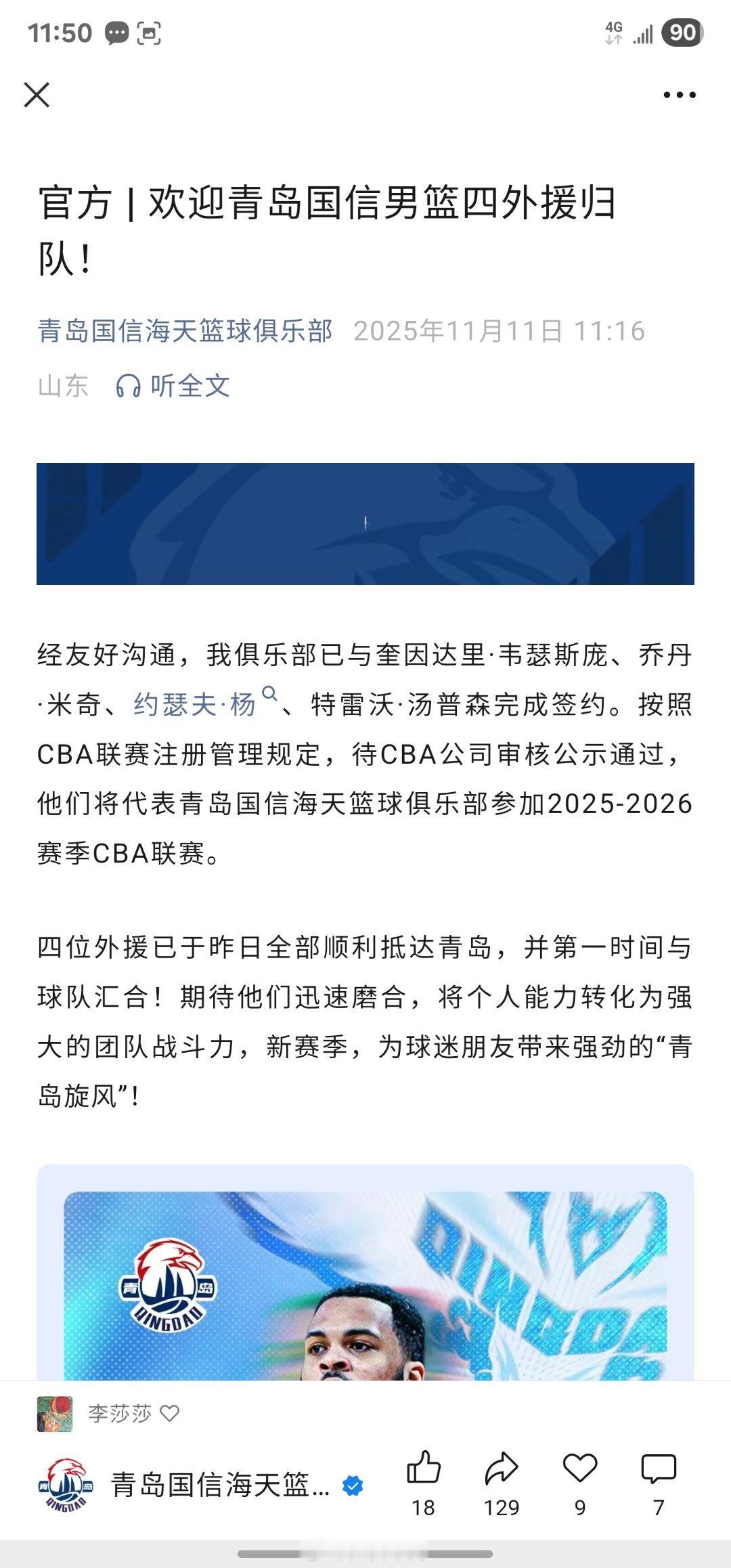 官宣四外援到位[耶][耶]青岛男篮四外援到位