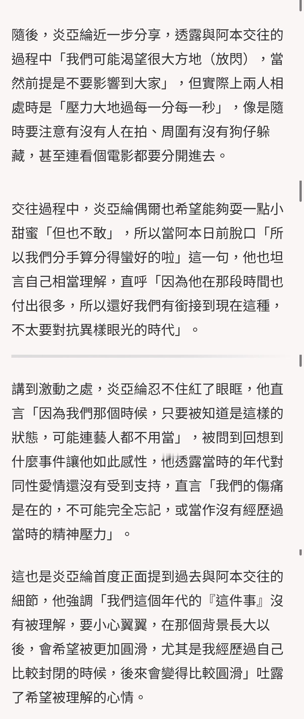 炎亚纶承认和阿本交往过!!近日炎亚纶受台媒专访认爱阿本,更透露和阿本交往细节:「我们可能渴望很大方地(放闪),当然前提是不要影响到大家」讲到激动之处,炎亚纶忍不住红了眼眶,他直言「因为我们那个时候,只要被知道是这样的状态,可能连艺人都不用当」他表示自己可以理解阿本说他们分开得很好,毕竟当时阿本也付出很多。