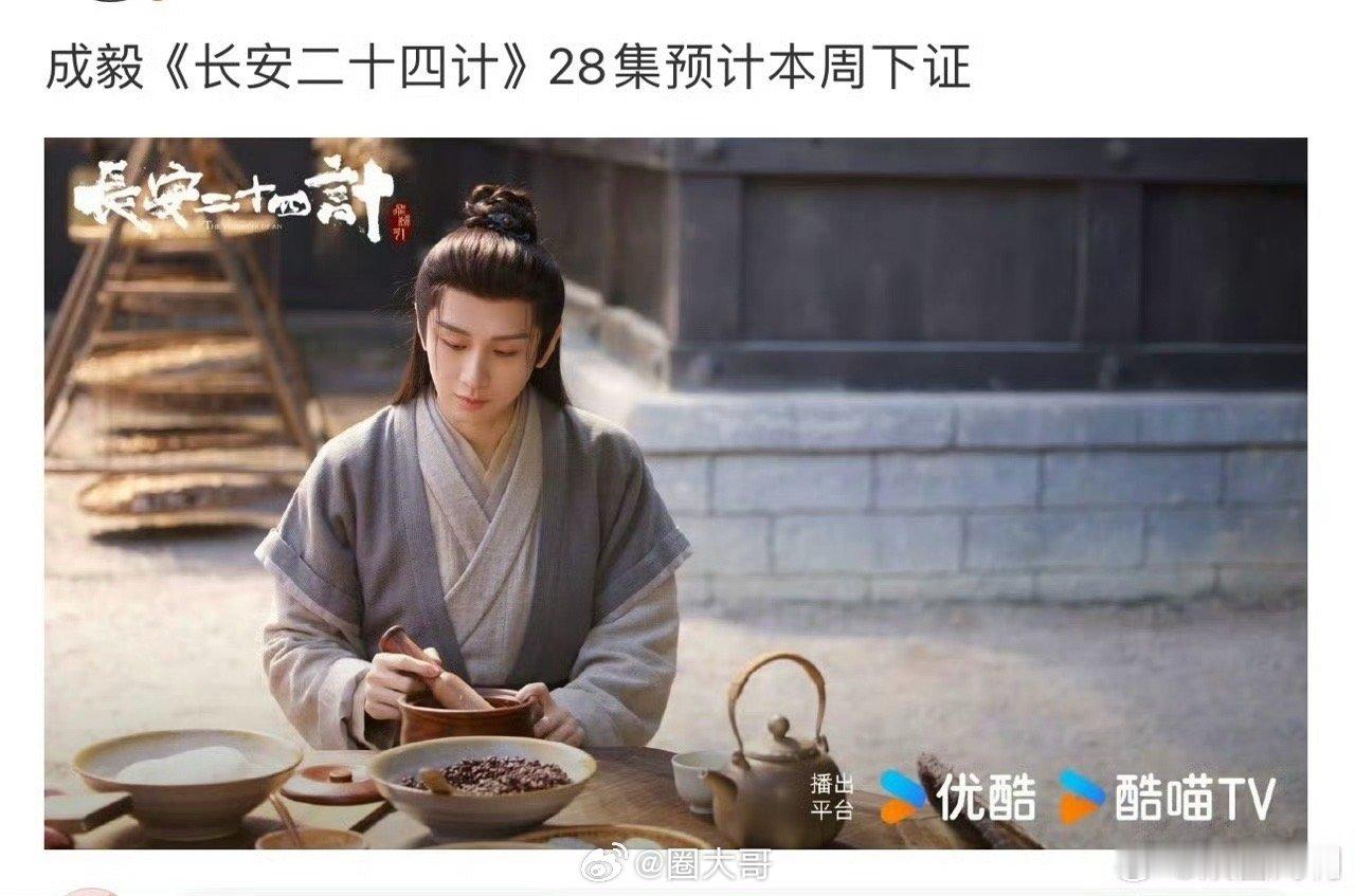 哇塞,终于等来成毅《长安二十四计》的新消息了吧,这部剧有28集,预计在本周下证,成毅在剧中的造型很是带感,已经等不及要追剧了!