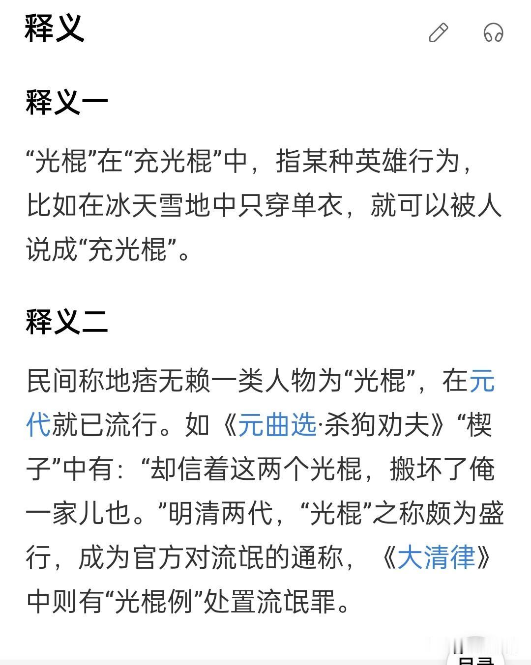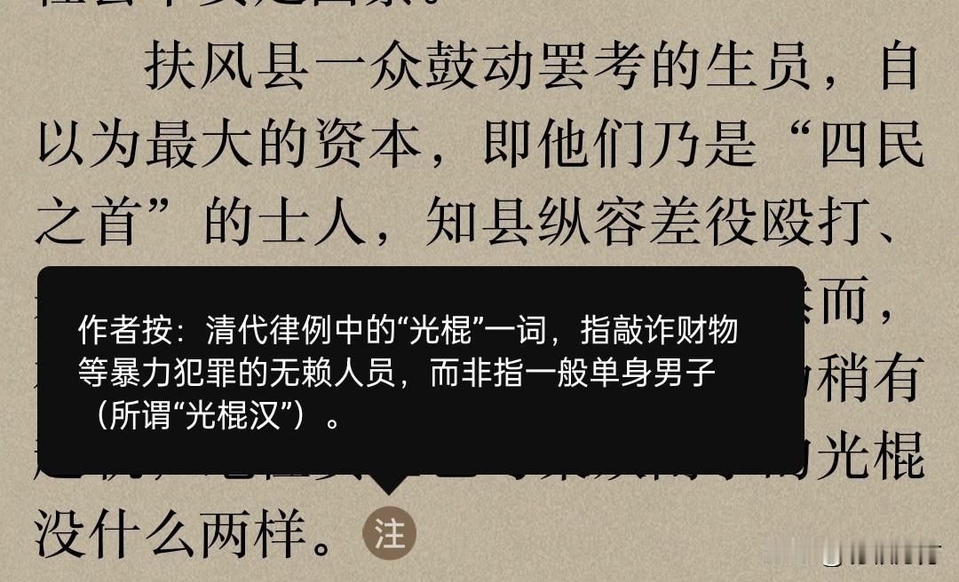 光棍这个词在现代汉语里多指单身,开始时专指男性,现在好象男女通用了。 在《州县之民》一书中有个词条叫“山陕题定光棍之例”,作者解释“光棍是指敲诈勒索的地痞无赖”。河南话里也有“光棍儿”一词,除了指单身之外,还有“穿着阔气、体面”的意思,两者发音声调稍有不同。有意思的是后一种含义虽然听着象是褒义,但也没有人当面这么夸人,有点儿类似普通话里“人五人六”的用法。看到清代“光棍”的含义,我想这里面可能有些联系,勒索人的无赖是有可能吃好穿好的,别的人看了虽然也羡慕,但内心上还是看不起这类人,只能背地里说这人“光棍儿”。时间久了,本意忘了,只剩下“衣着光鲜”的意思,但隐隐约约的又有点儿贬意。[笑哭]
