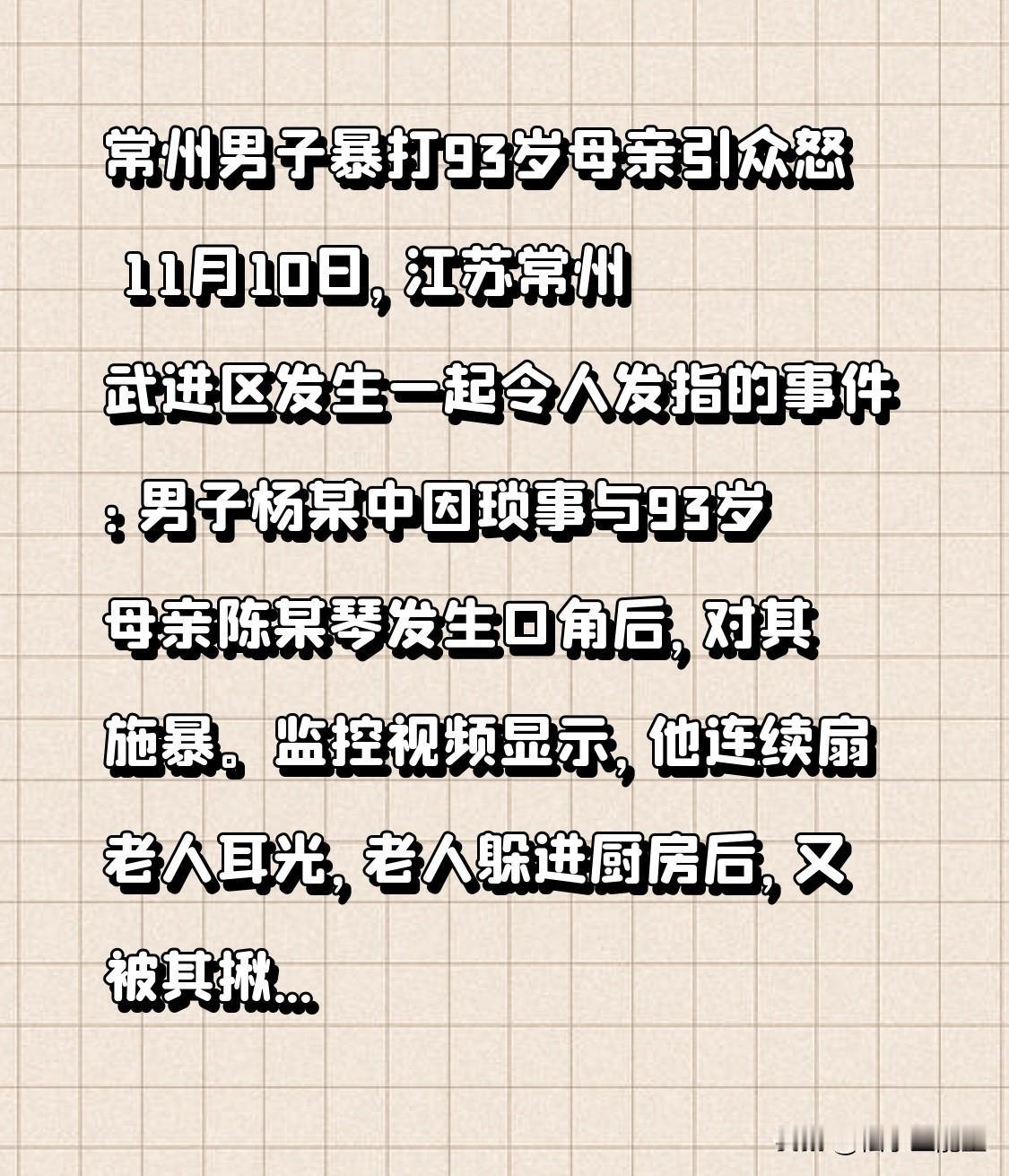 常州男子暴打93岁母亲引众怒 11月10日,江苏常州武进区发生一起令人发指的事件:男子杨某中因琐事与93岁母亲陈某琴发生口角后,对其施暴。监控视频显示,他连续扇老人耳光,老人躲进厨房后,又被其揪发摁地殴打,哀嚎声令人揪心。 事件曝光后引发全网谴责,网友怒斥其违背人伦。11日,当地官方通报,杨某中已被抓获,案情正侦办。妇联与派出所已上门照料老人,保障其安全。家暴绝非家事,殴打高龄母亲更是触碰法律与道德底线,全社会需合力守护老年人权益。